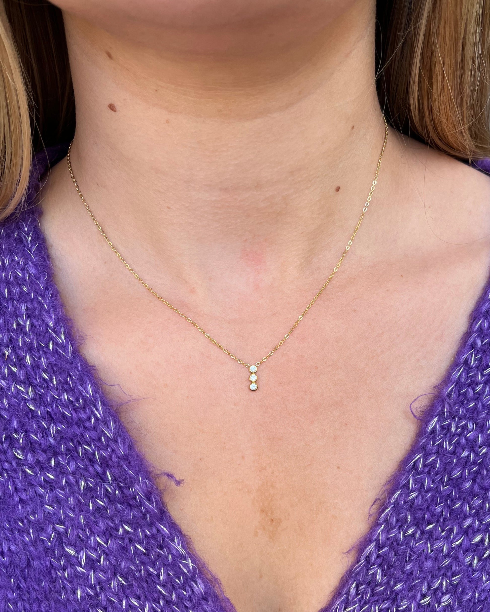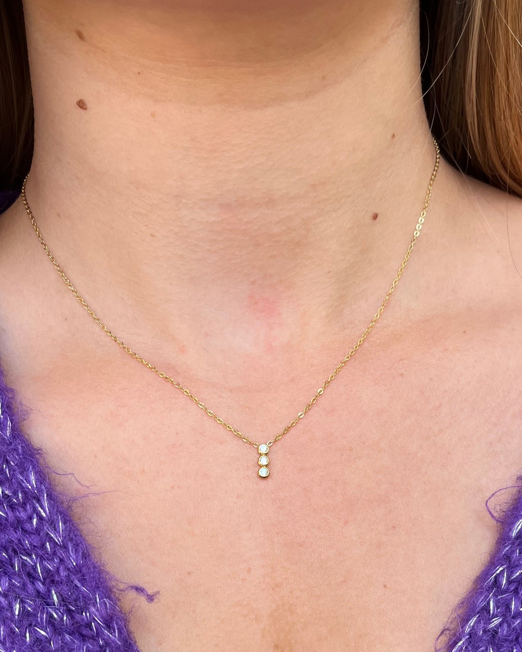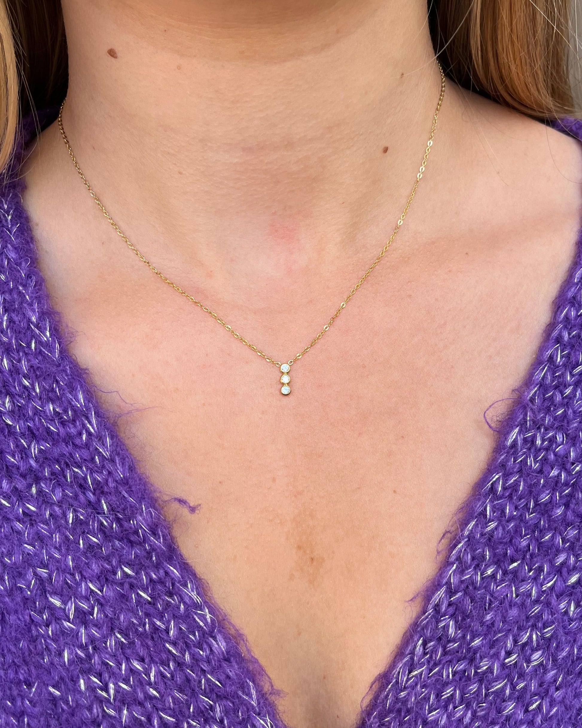 Laissez-vous séduire par ce collier raffiné en acier inoxydable, orné d’un pendentif délicat serti de trois oxydes de zirconium. Discret et élégant, il apporte une touche de brillance subtile à vos tenues, aussi bien au quotidien que lors de vos occasions spéciales. Un bijou intemporel qui capte la lumière avec éclat.