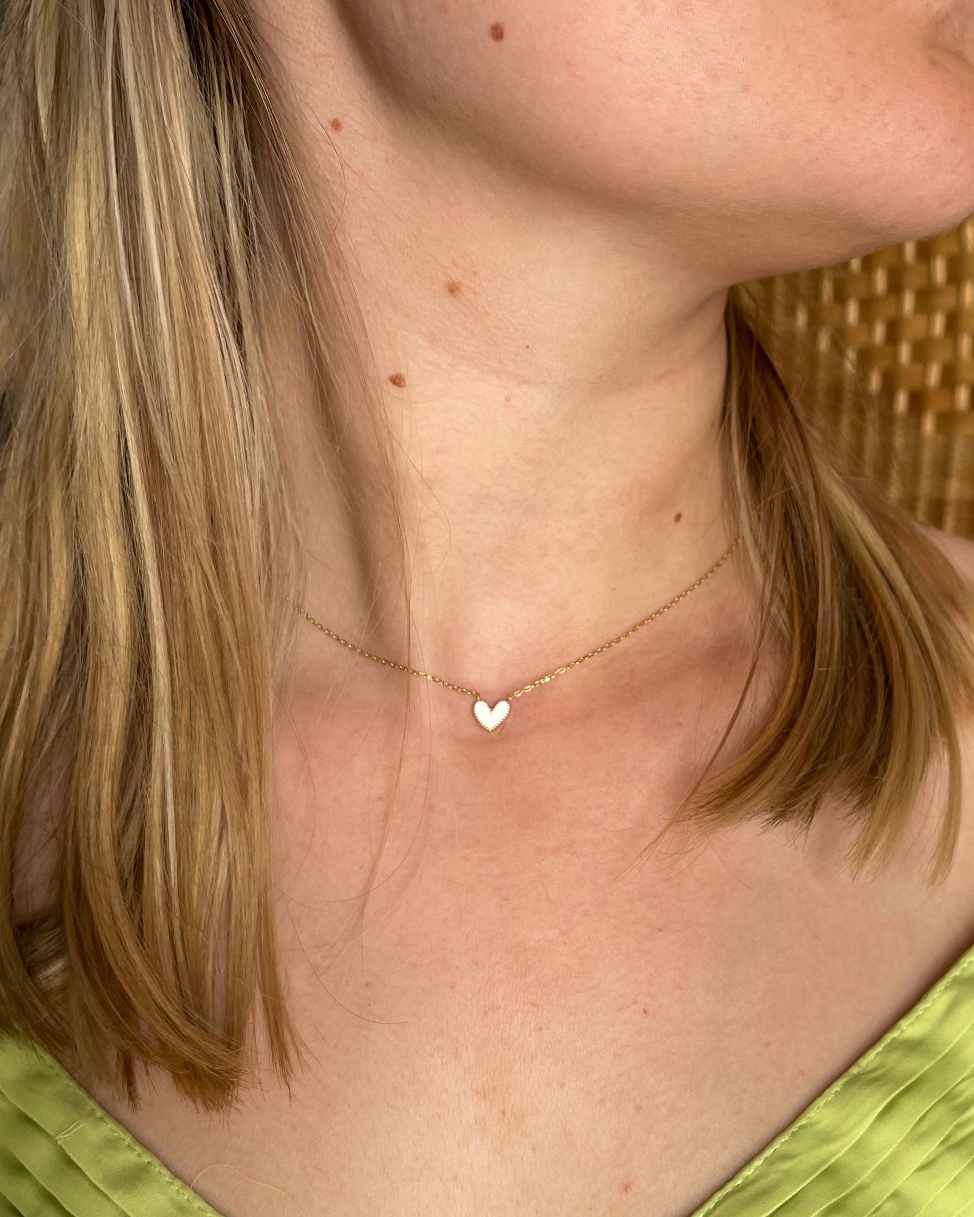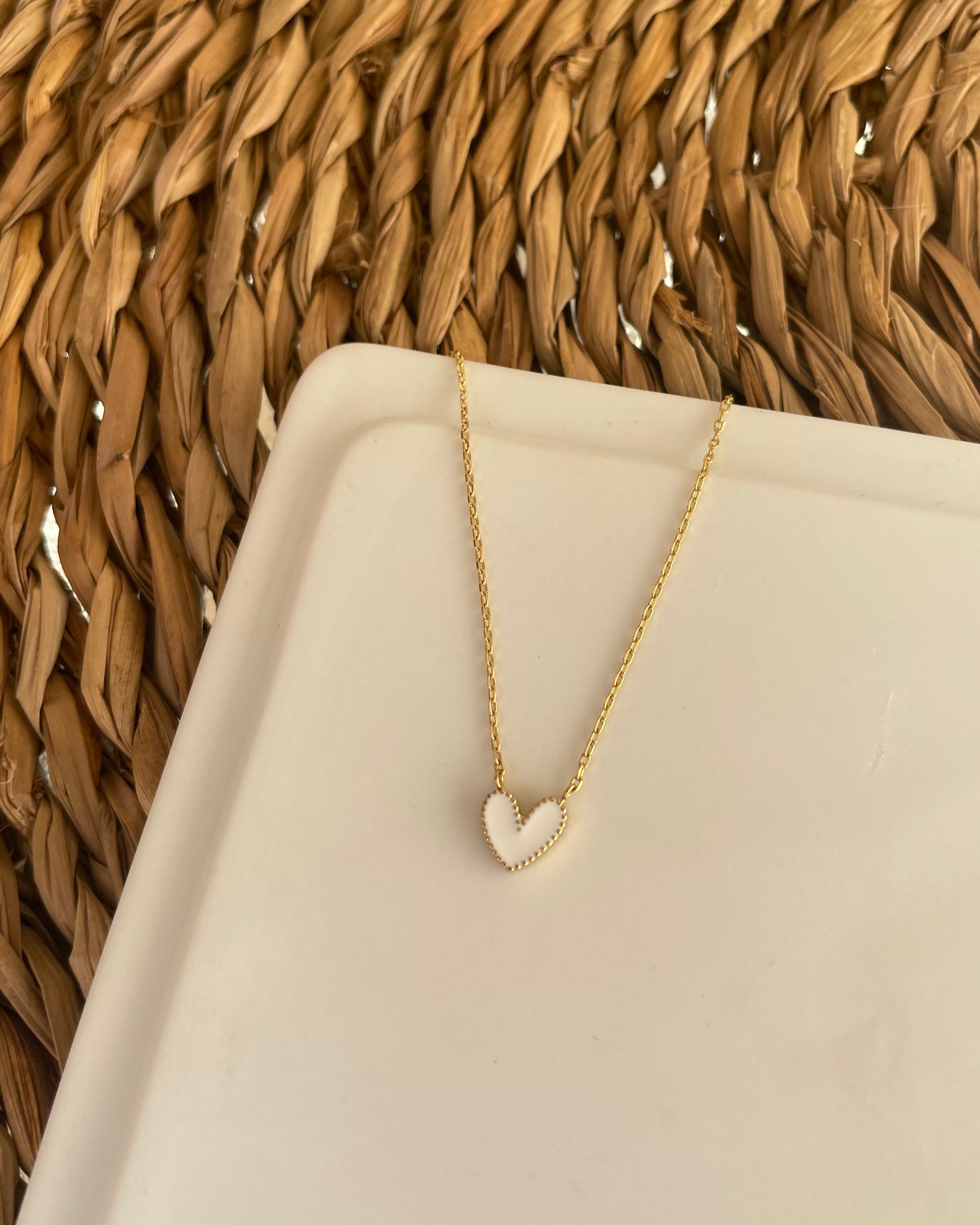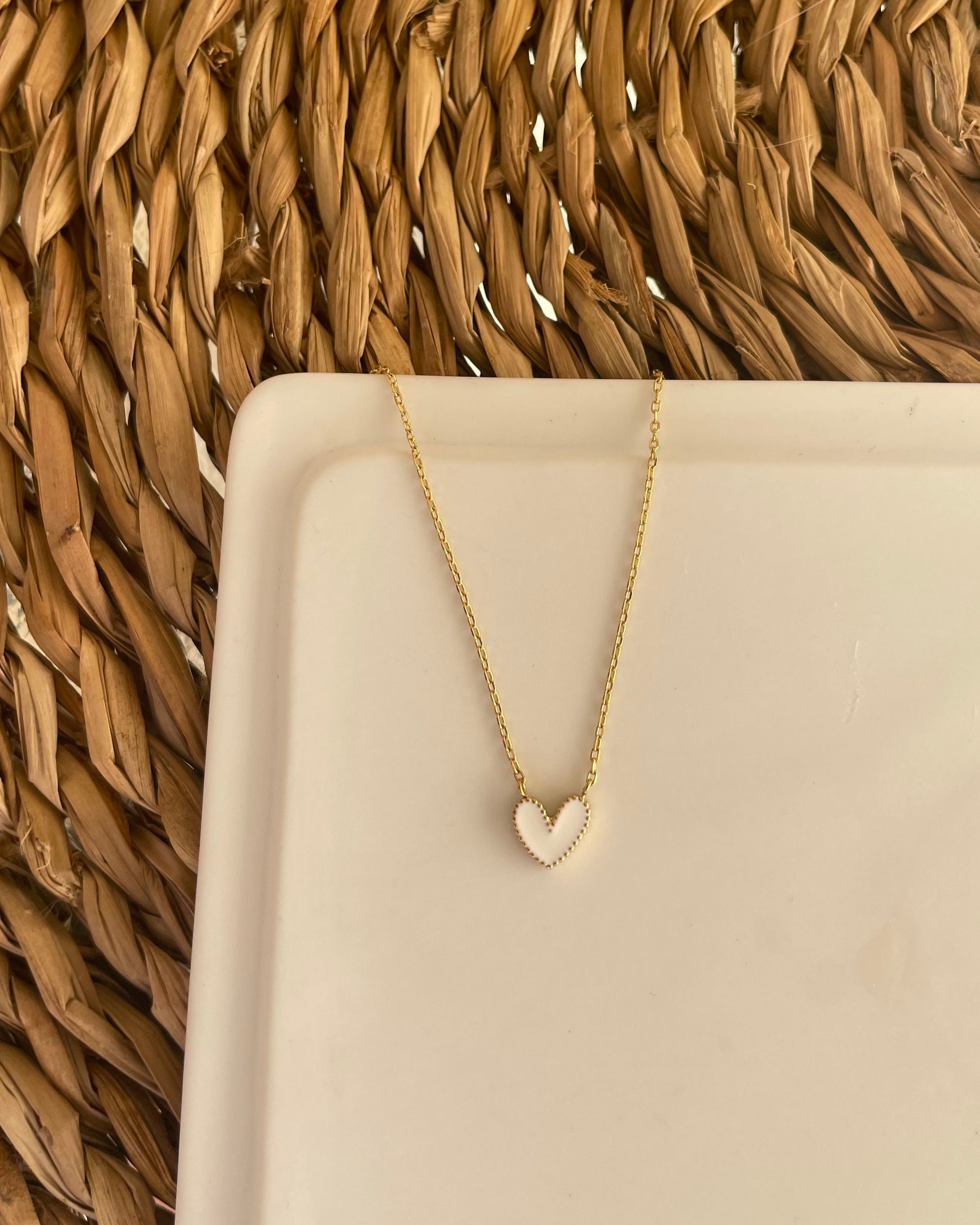 Un bijou tout en sobriété et en délicatesse. Ce collier doré se pare d’un petit cœur blanc, symbole de pureté et de douceur. Son design minimaliste et raffiné en fait un indispensable du quotidien, facile à associer, que ce soit seul ou en superposition avec d’autres colliers.