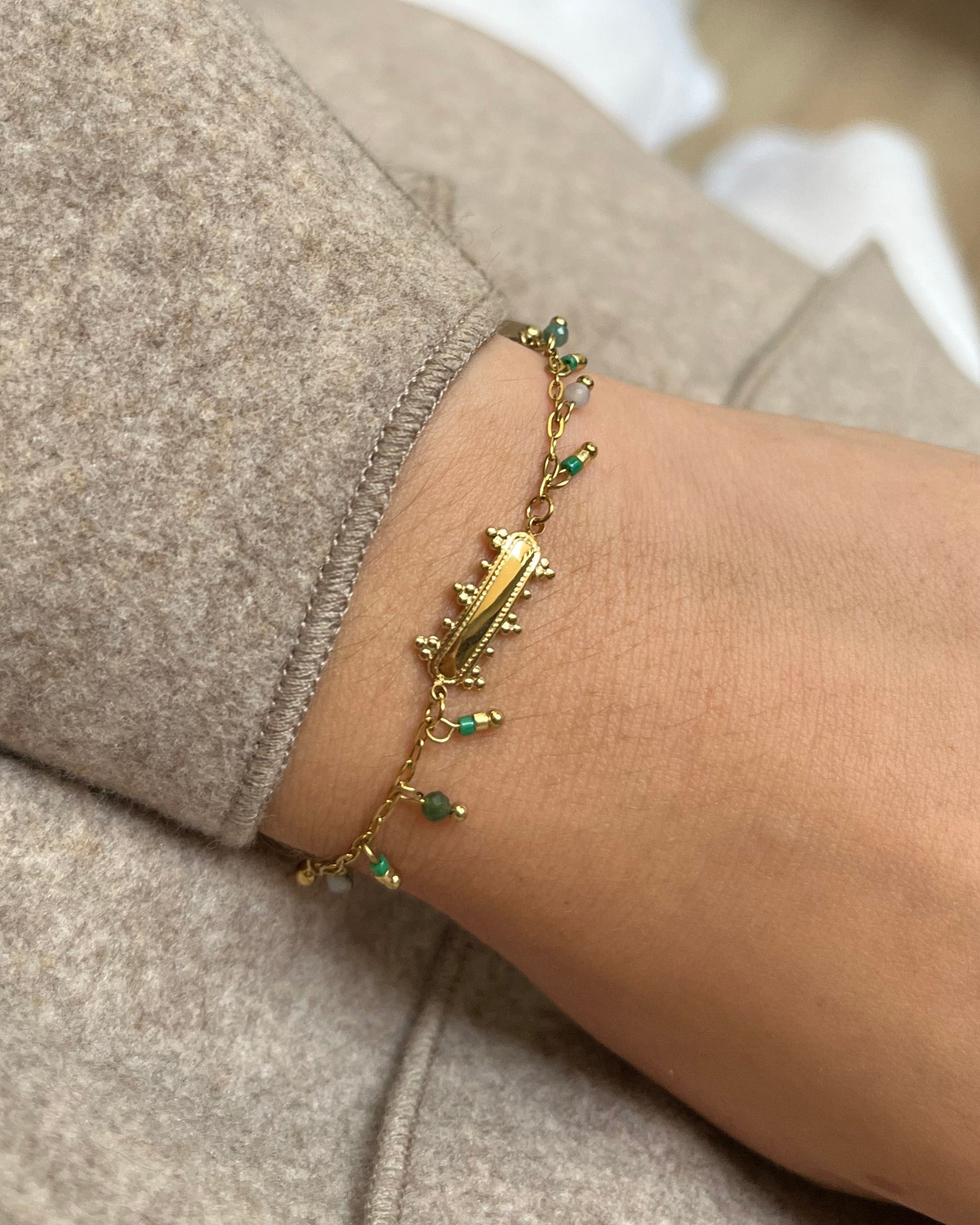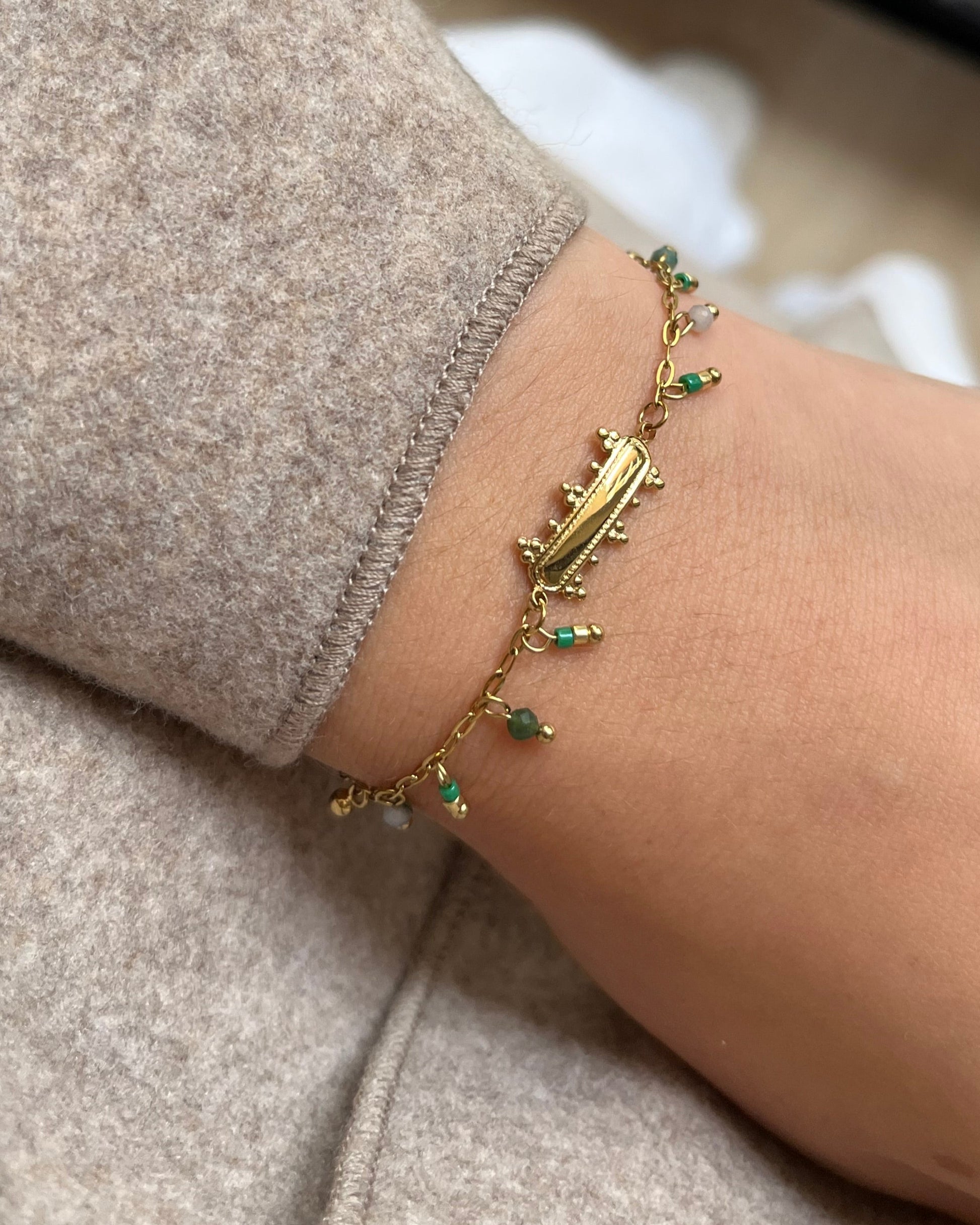 Apportez une touche raffinée et naturelle à vos tenues avec ce bracelet doré, orné de pierres naturelles pendantes et d’une barre délicate. Son design élégant et féminin s’adapte parfaitement au quotidien comme aux occasions spéciales. Un bijou chic et intemporel qui sublime votre style avec subtilité.