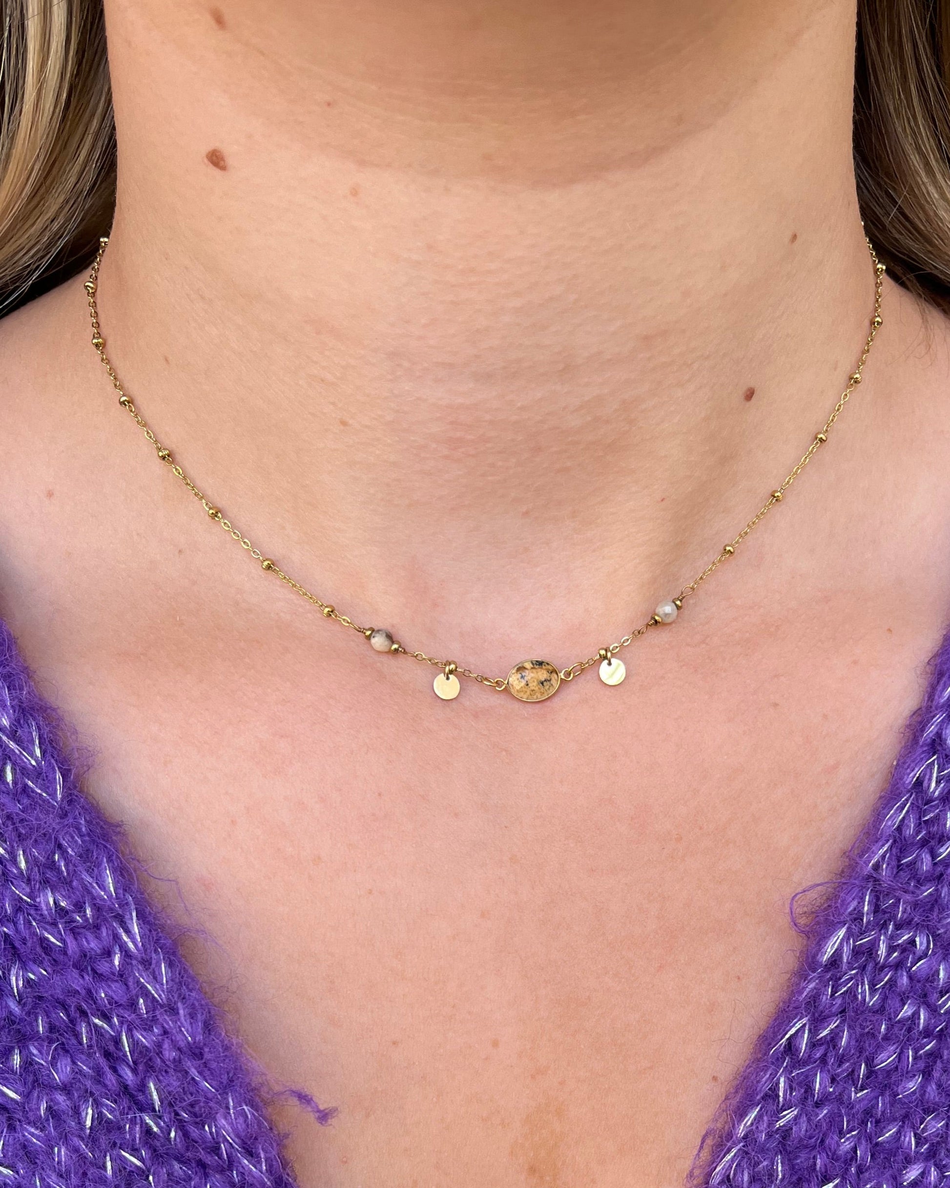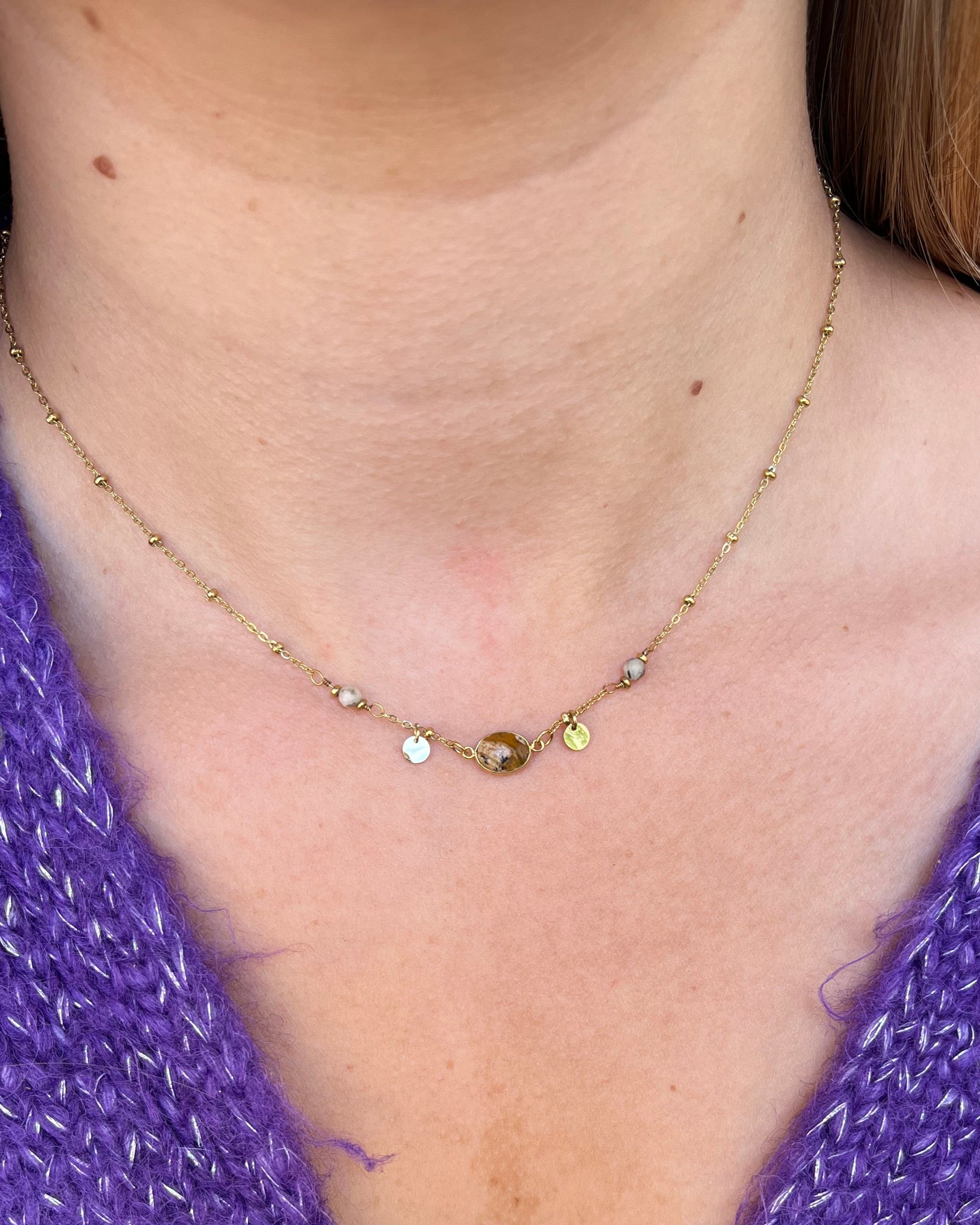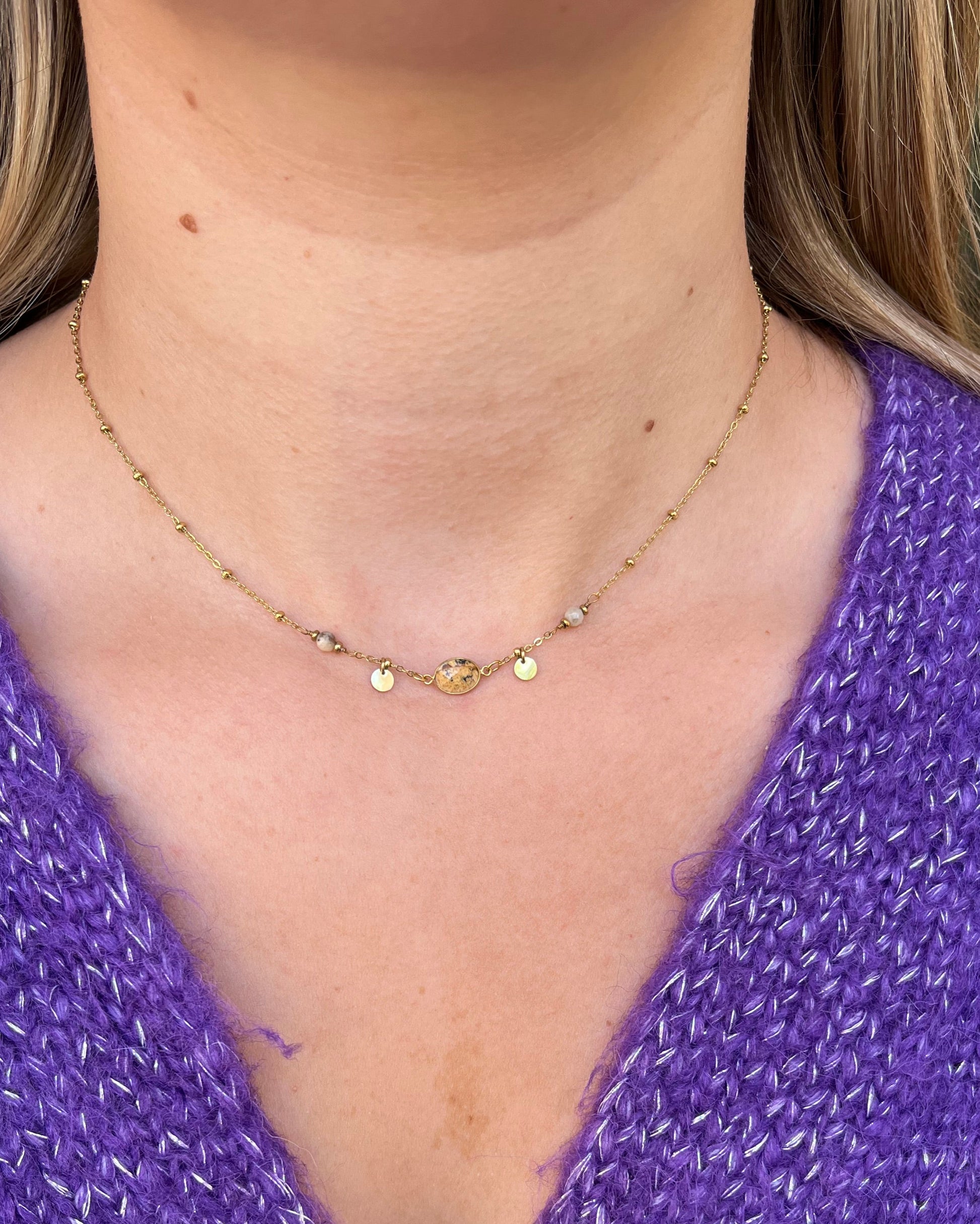 Succombez au charme de ce collier sur chaîne en acier inoxydable, composé d’une maille forçat agrémentée de boules, et sublimé par de délicates pampilles rondes, des pierres naturelles rondes ainsi qu’un pendentif ovale en pierre naturelle. Son design élégant et raffiné apporte une touche féminine et originale à toutes vos tenues, pour un bijou qui se suffit à lui-même.