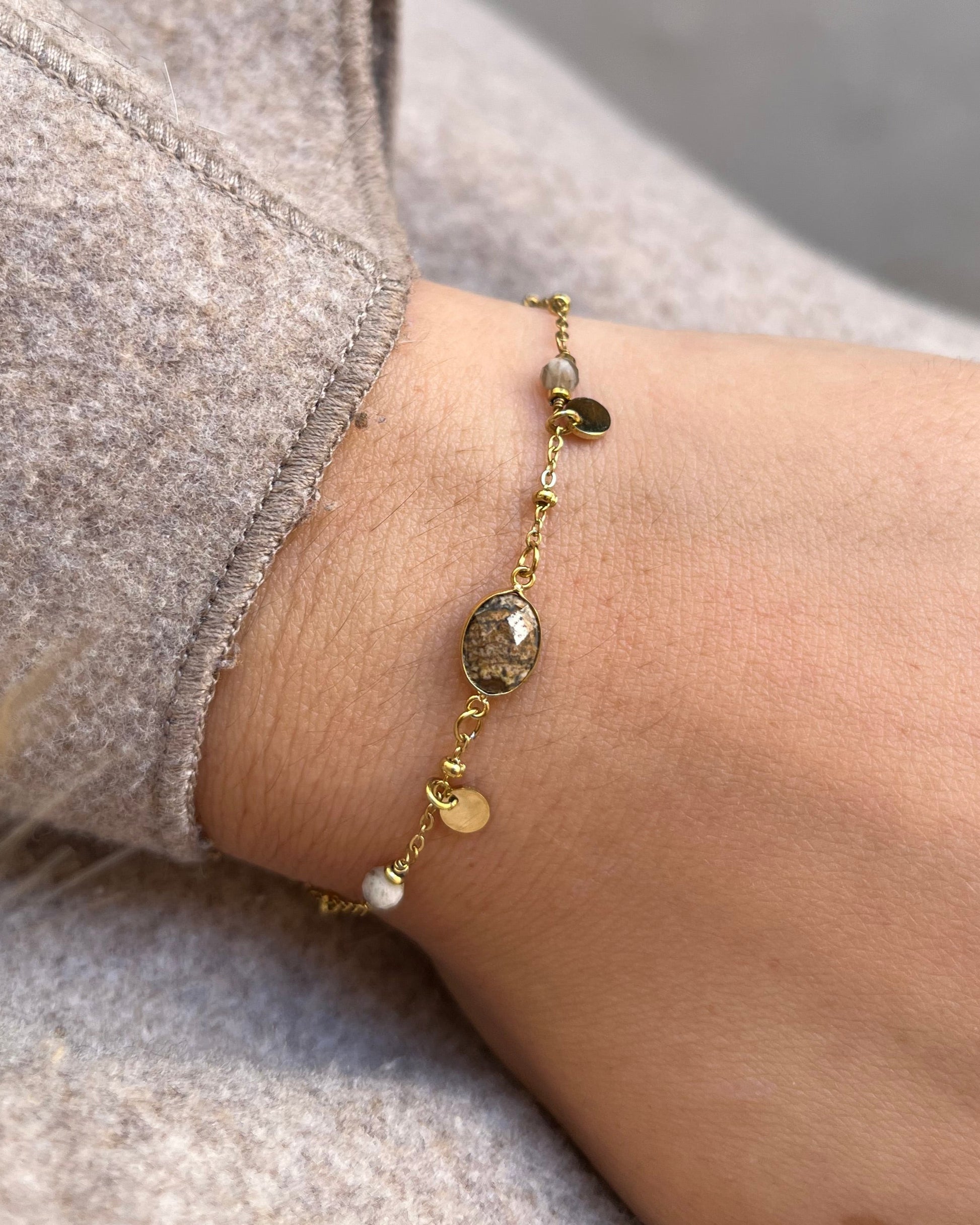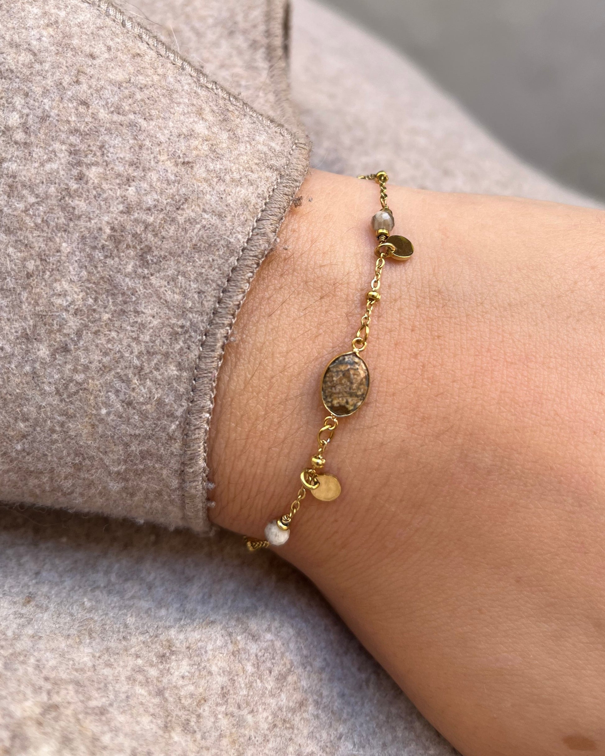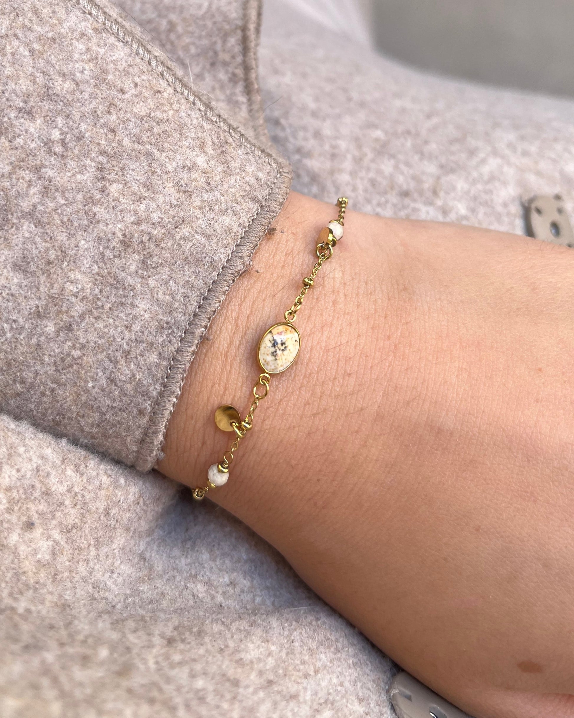 Succombez à l’élégance de ce bracelet sur chaîne en acier inoxydable, composé d’une maille forçat agrémentée de boules, et orné de pampilles rondes, de pierres naturelles rondes ainsi que d’un pendentif ovale en pierre naturelle. Son design raffiné et féminin fait de ce bijou une pièce unique, parfaite pour sublimer votre poignet avec délicatesse.
