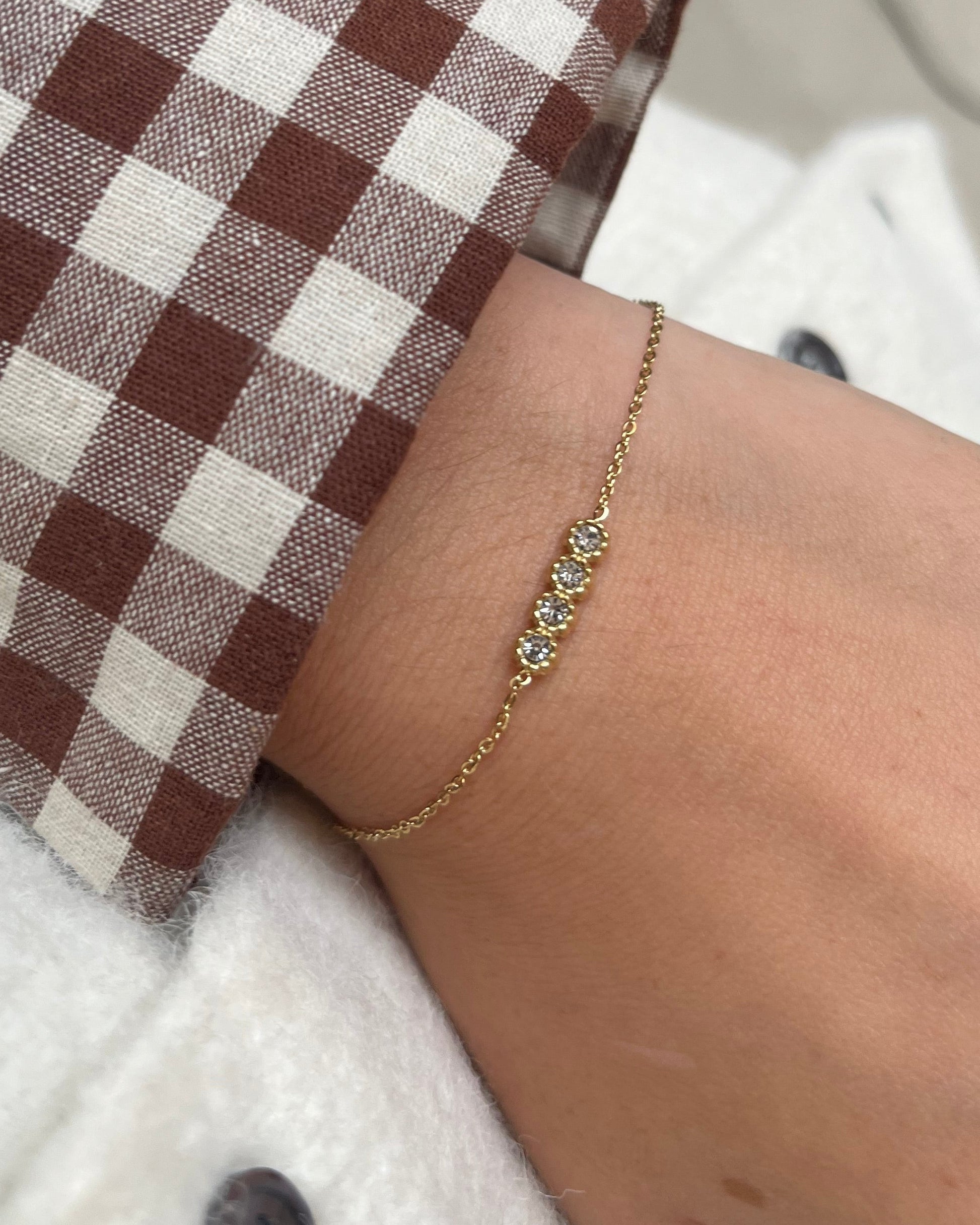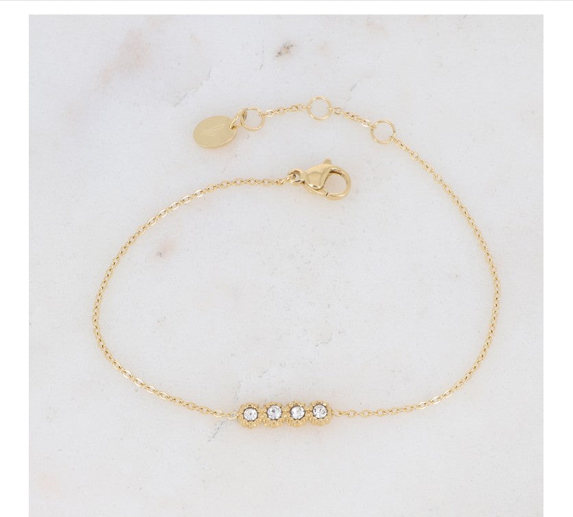 Ce bracelet en acier inoxydable séduit par son élégance intemporelle et ses détails raffinés. Il est orné d’une rangée délicate de 4 oxydes de zirconium, subtilement sertis pour refléter la lumière à chaque mouvement.