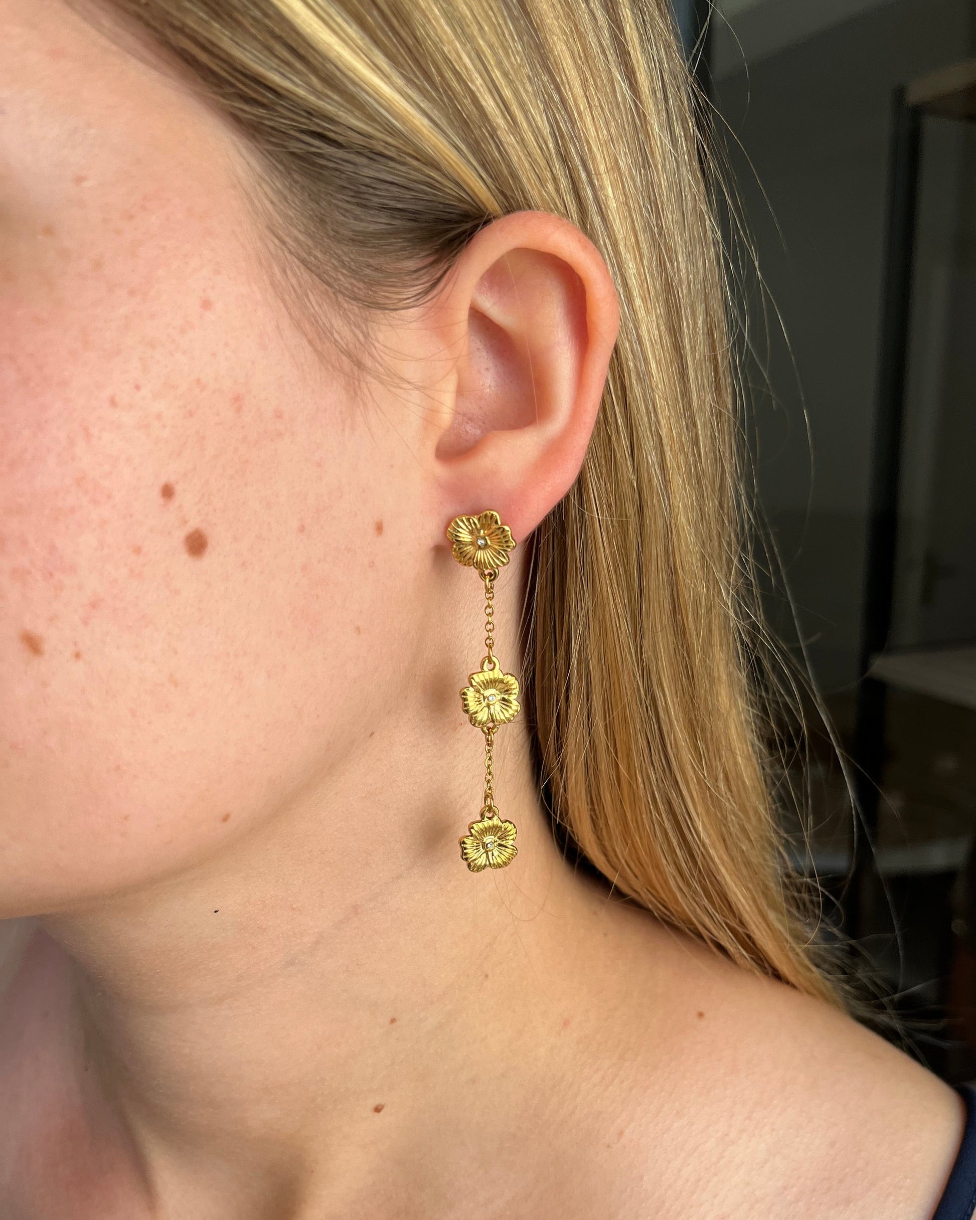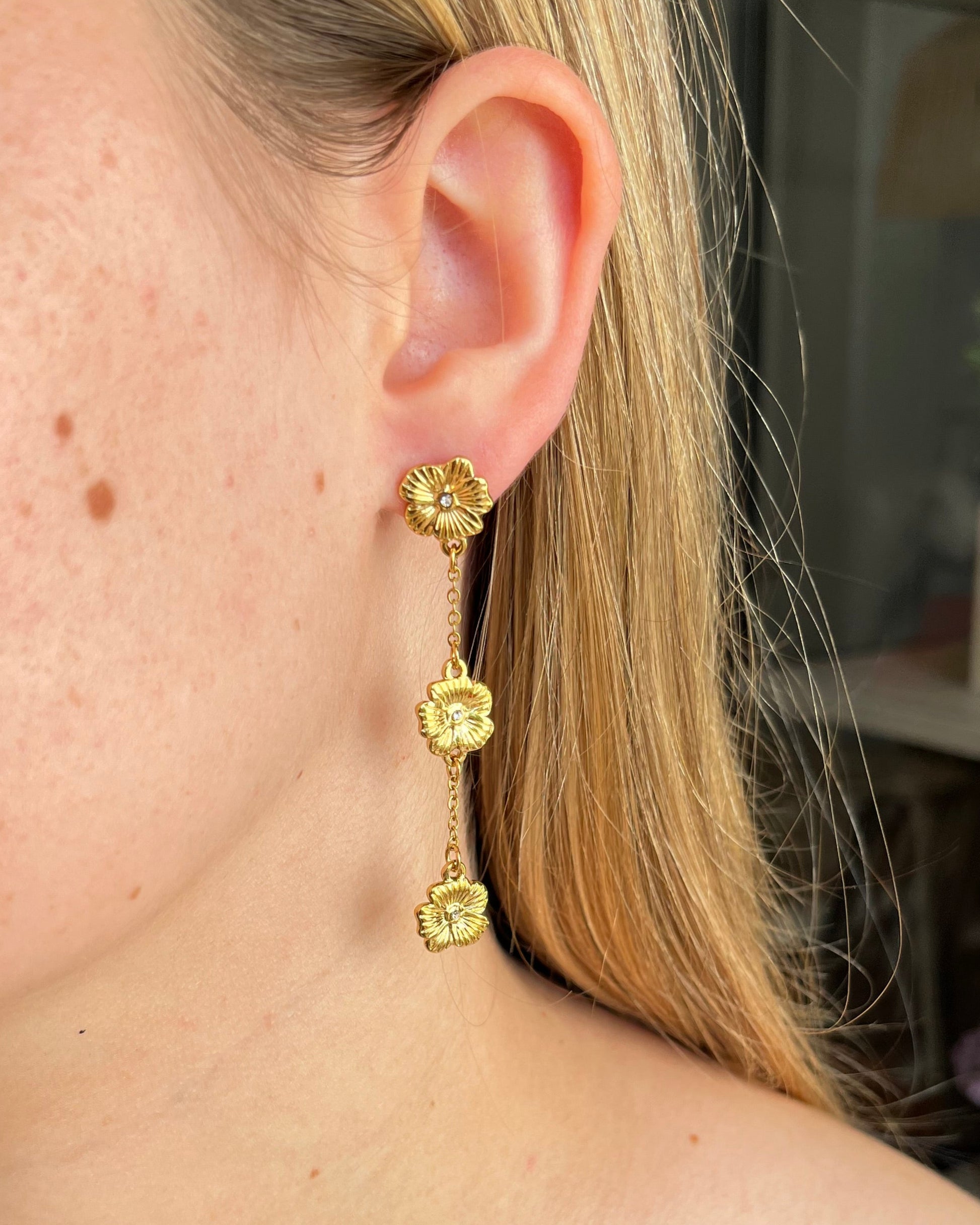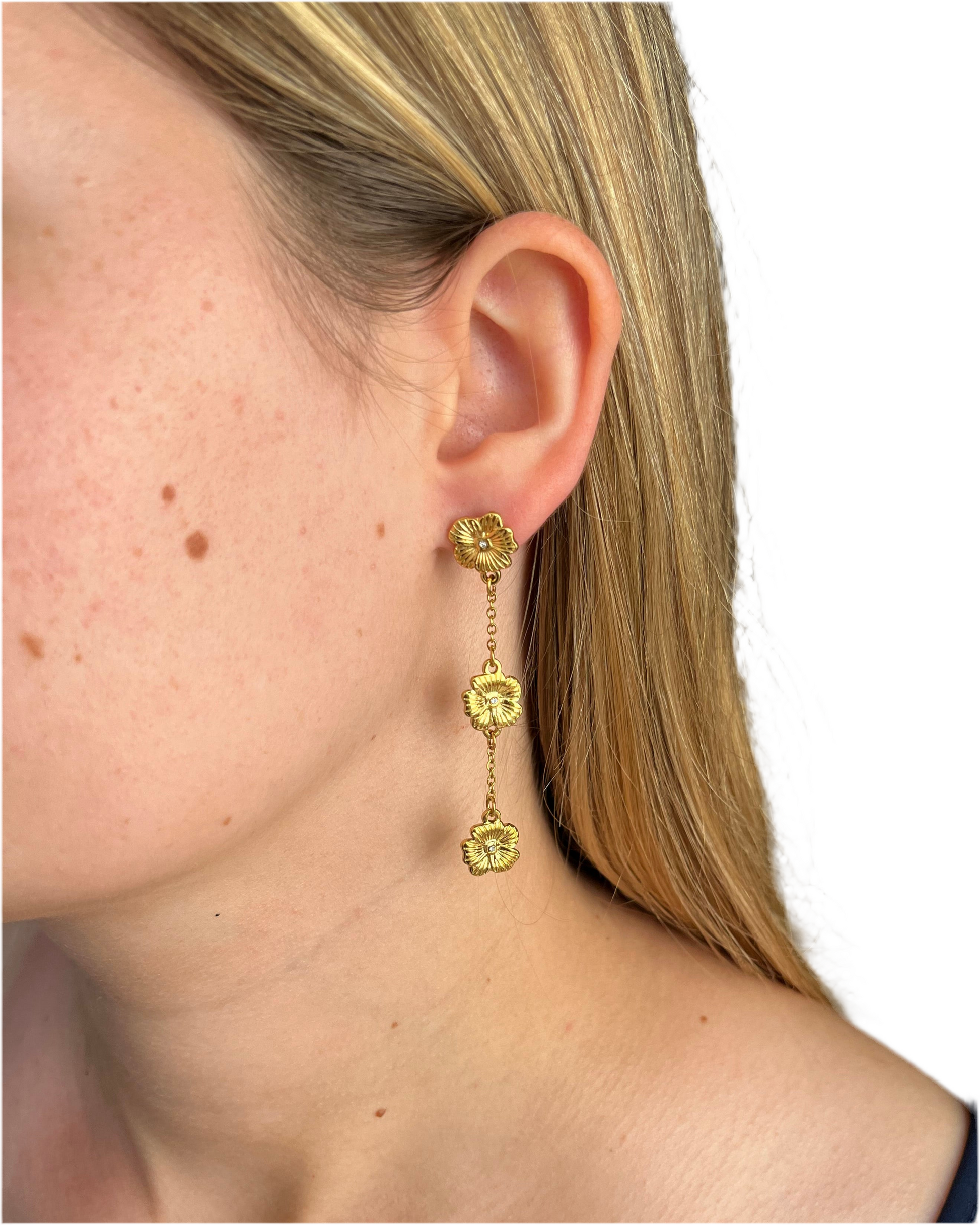 Trois fleurs délicates s’enchaînent en une danse légère et aérienne, suspendues à ces boucles d’oreilles dorées.
