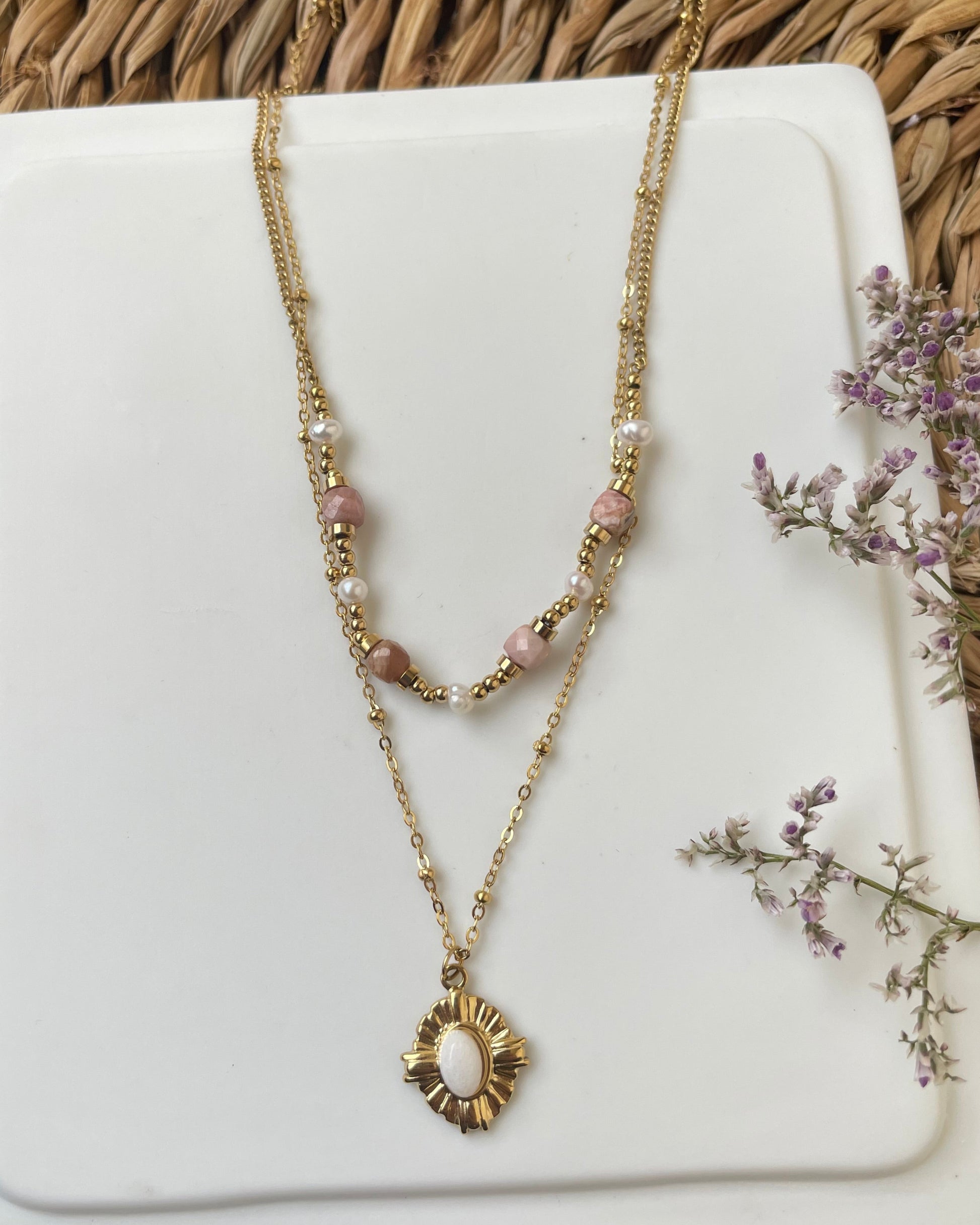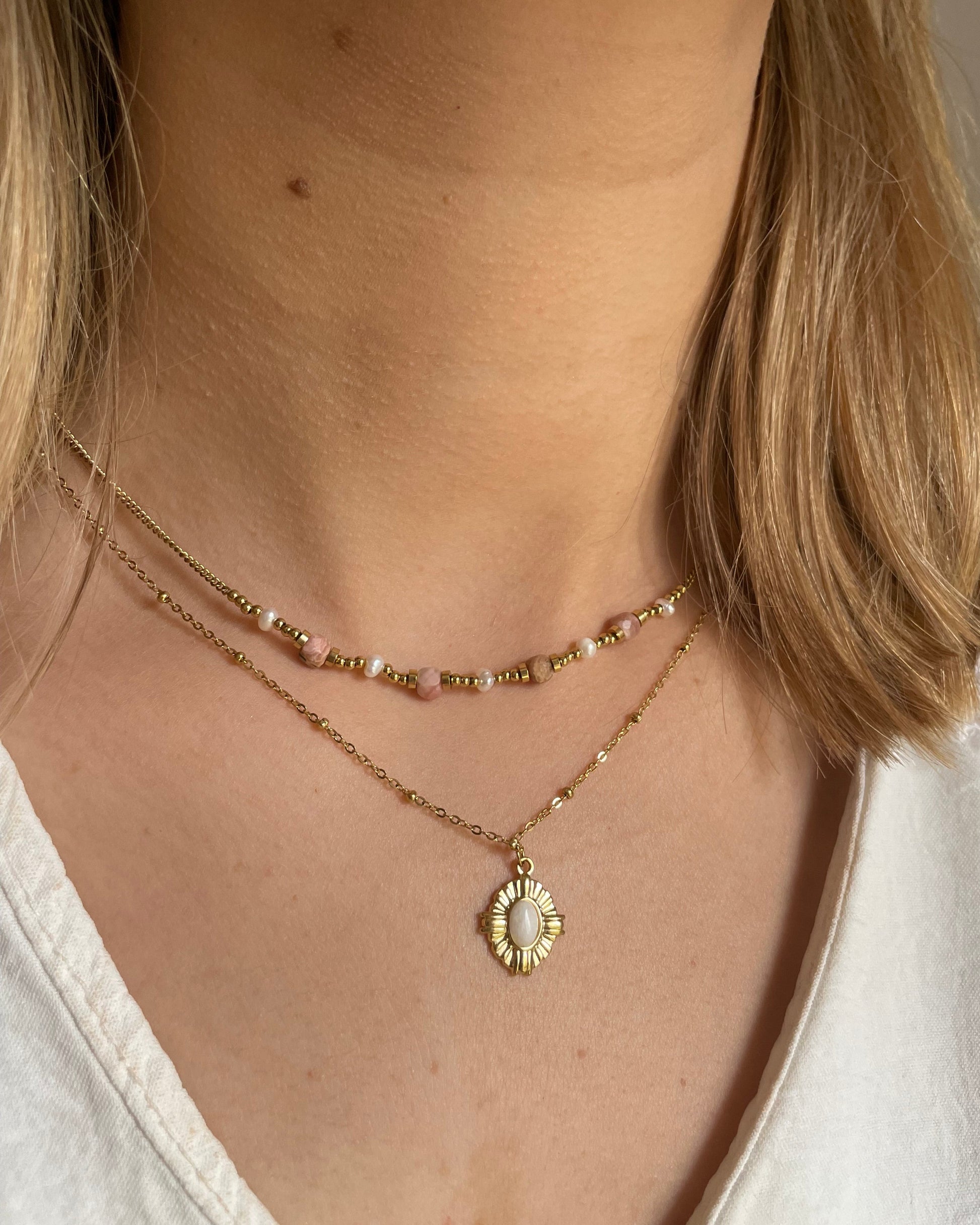 Ce collier est une ode à la féminité et à l’élégance, avec son design à double rang qui joue sur les contrastes et la délicatesse. La première chaîne, ornée de perles roses douces, apporte une touche de douceur et de raffinement, tandis que la seconde, plus épurée, est sublimée par un pendentif doré.