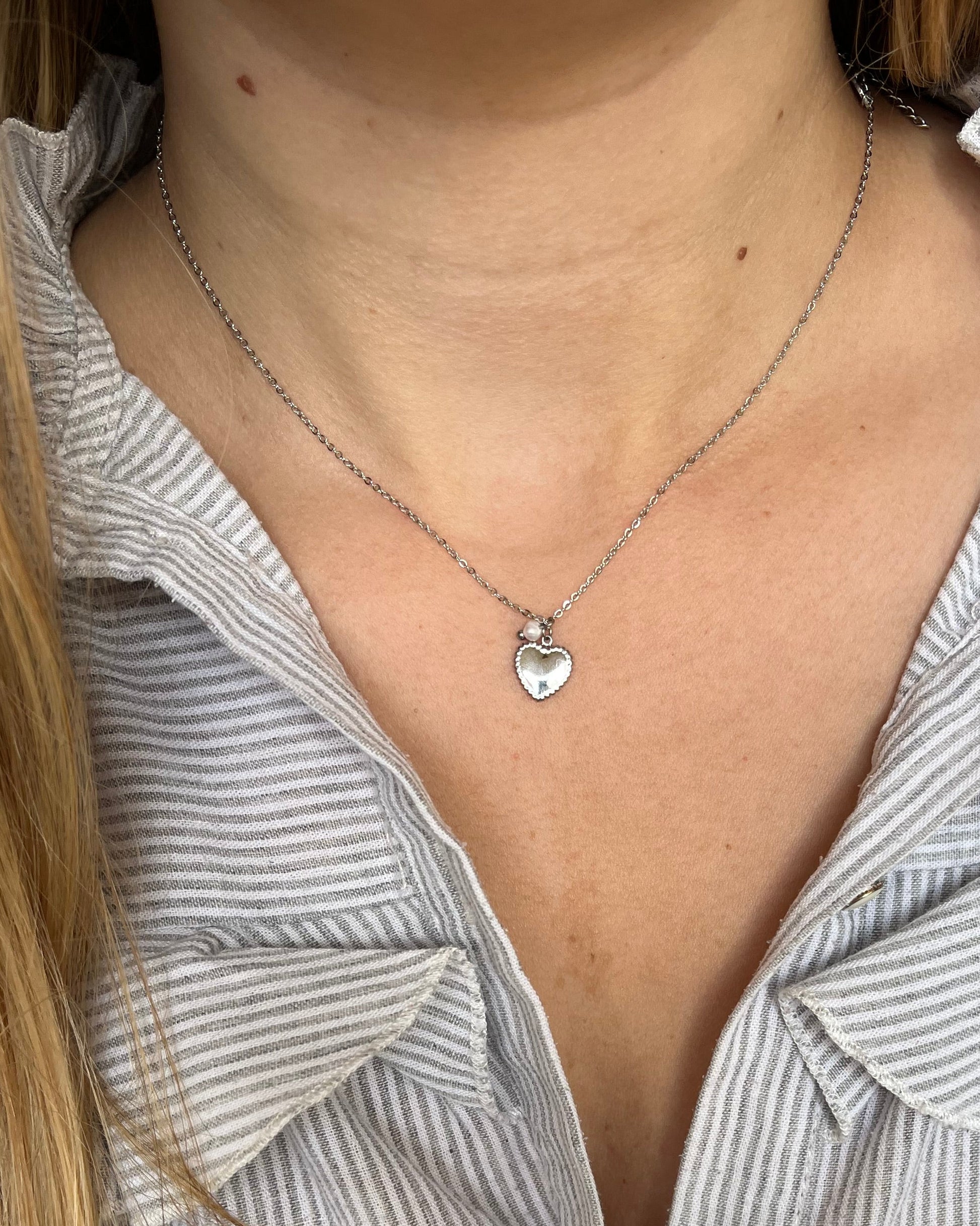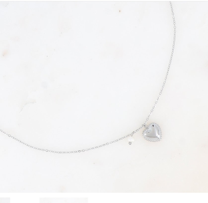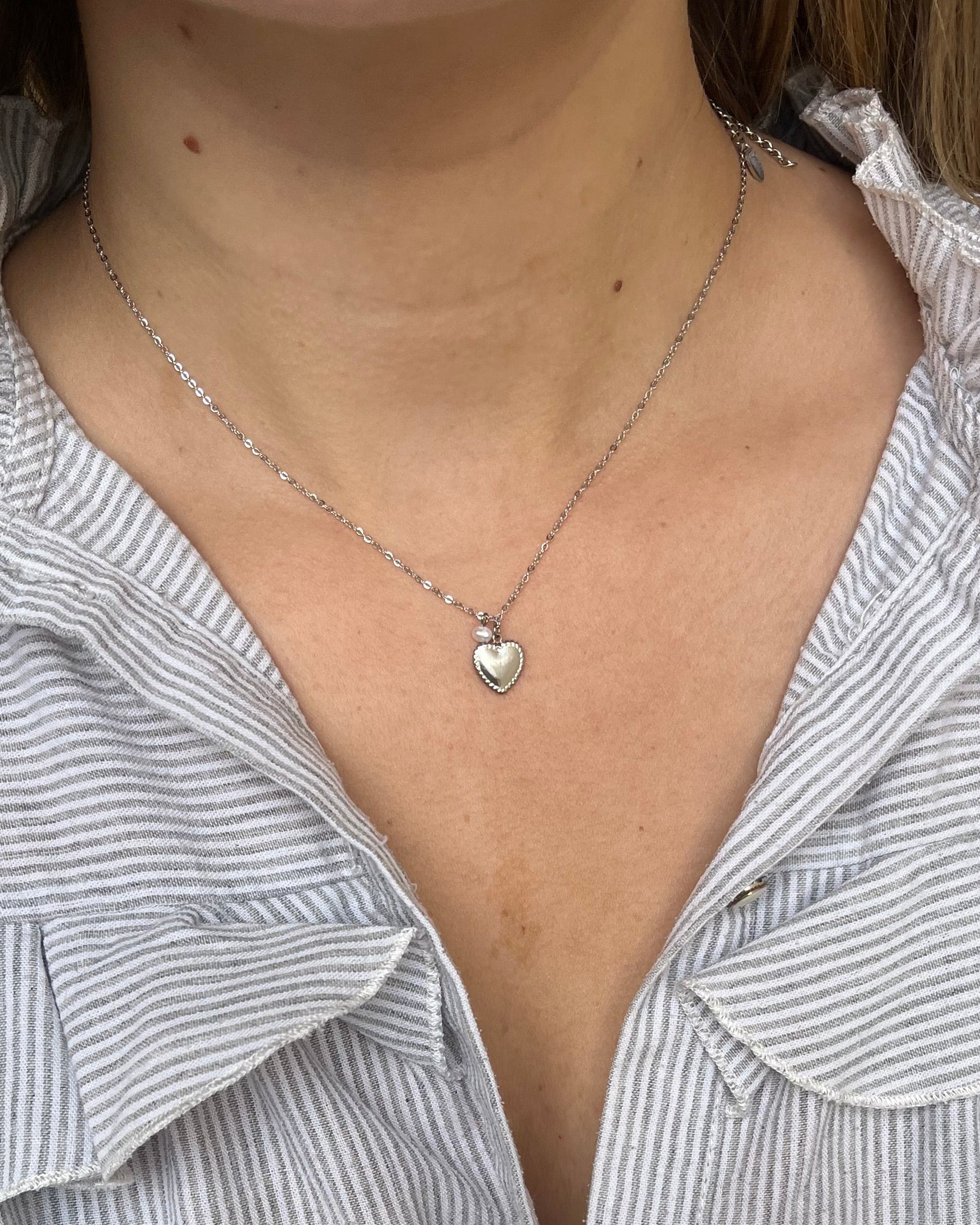 Apportez une touche romantique et raffinée à vos tenues avec ce collier argenté, orné d’un cœur délicatement travaillé en milgrain et d’une perle d’eau douce élégante. Son design féminin et subtil en fait un bijou parfait pour le quotidien comme pour vos occasions spéciales. Un accessoire chic et intemporel qui sublime votre style avec douceur.