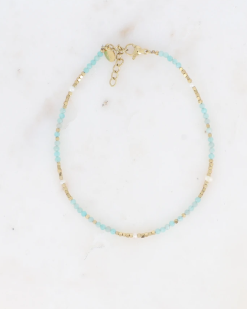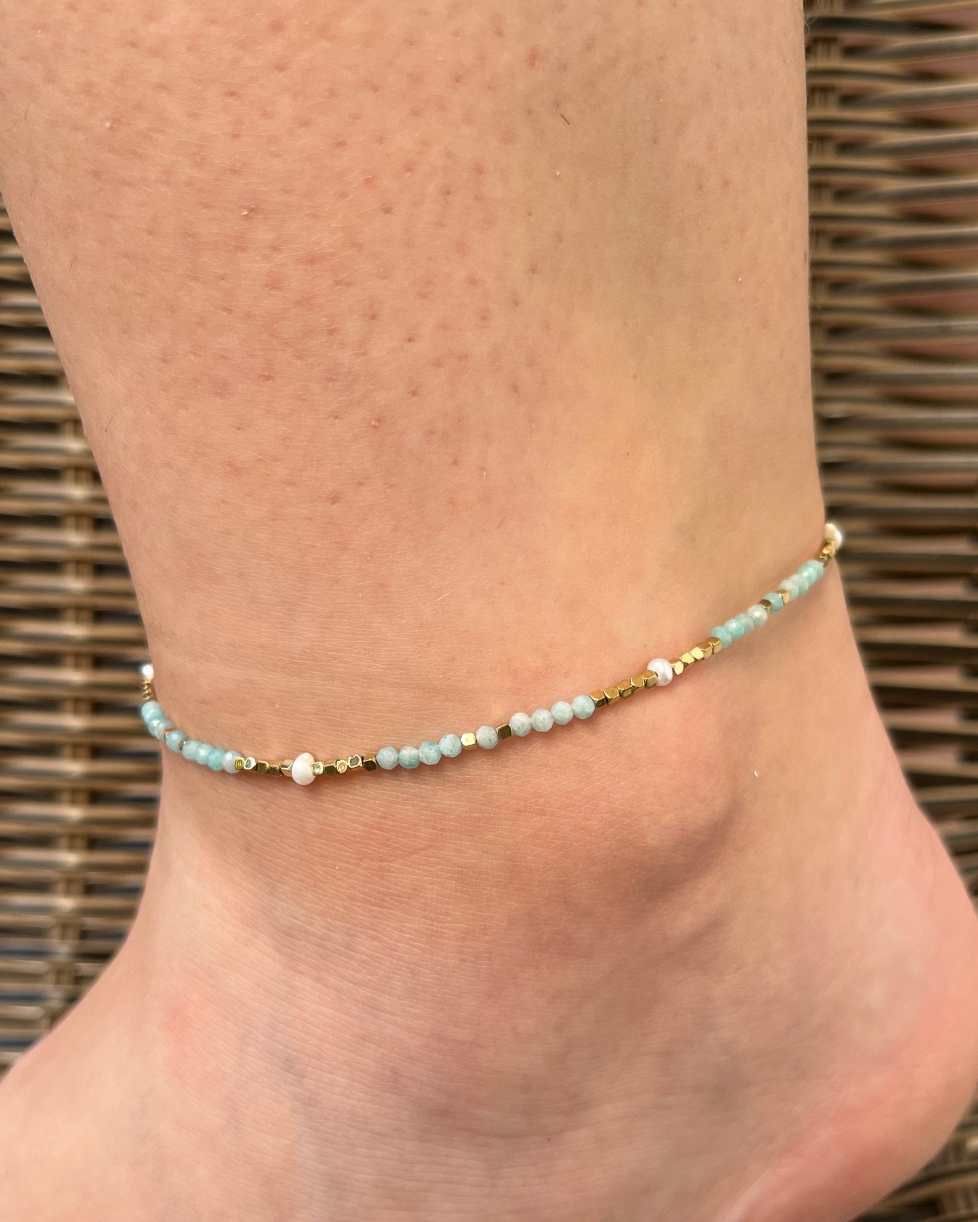 Succombez au charme du bracelet de cheville perlé, une pièce délicate et précieuse mêlant perles d’eau douce aux reflets nacrés et pierres naturelles bleues aux vibrations apaisantes.