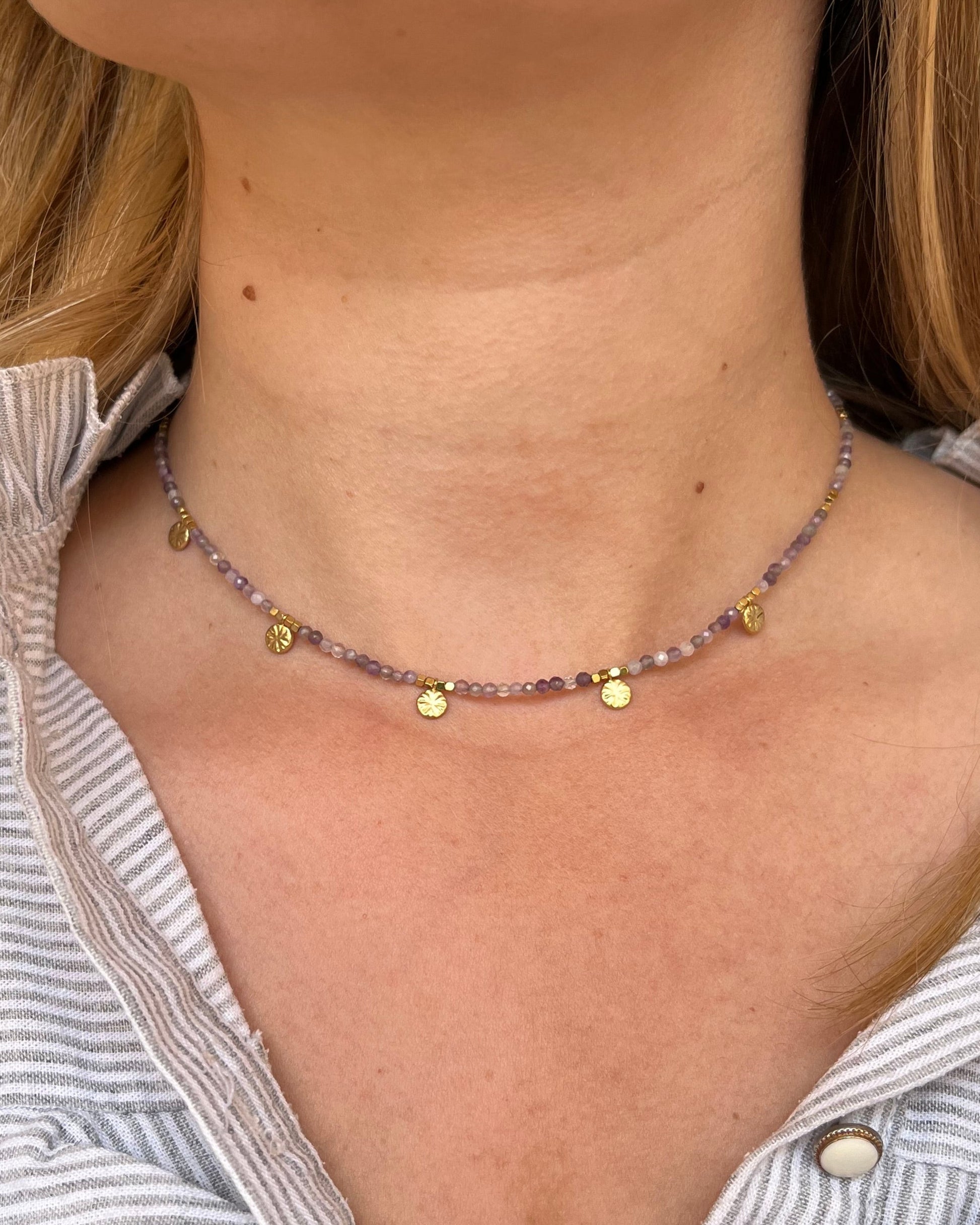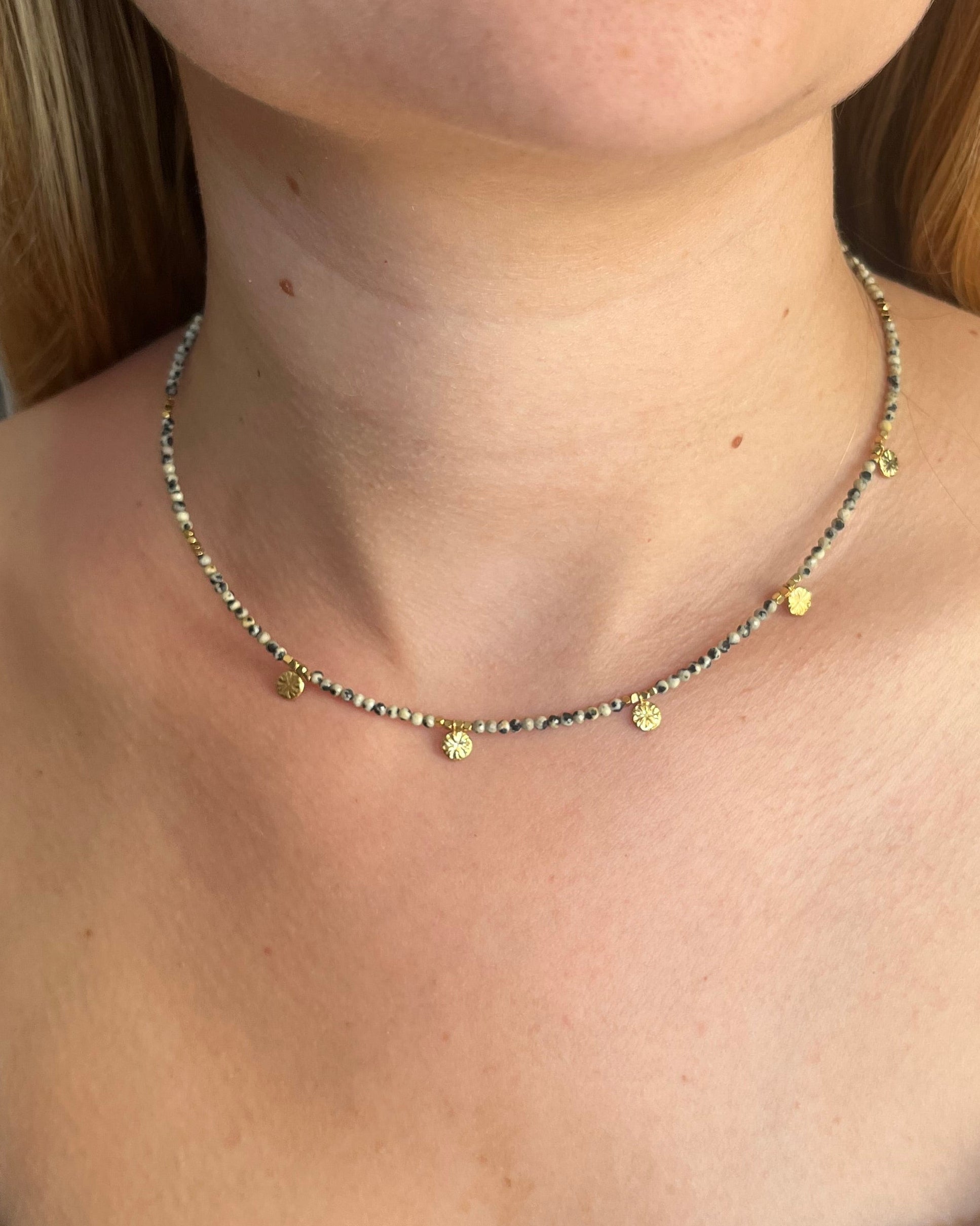 Alliance subtile entre nature brute et éclat doré, ce collier met à l’honneur une pierre naturelle de Jaspe Dalmatien, connue pour ses motifs mouchetés uniques, rappelant la robe d’un dalmatien.