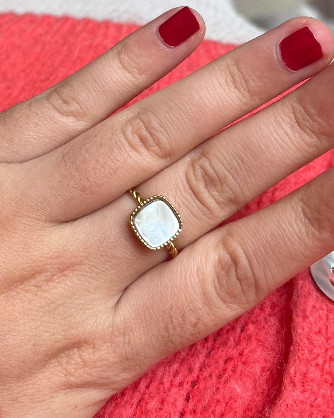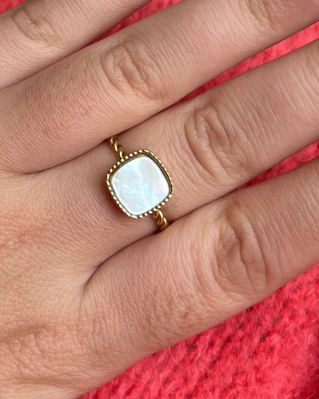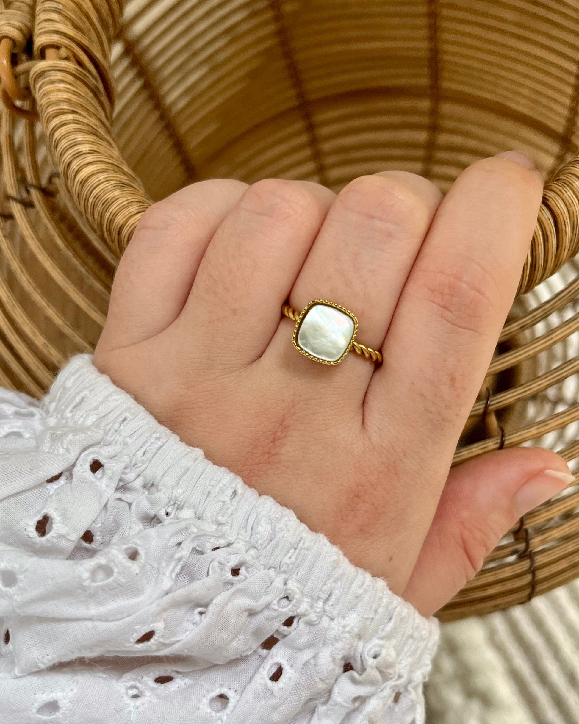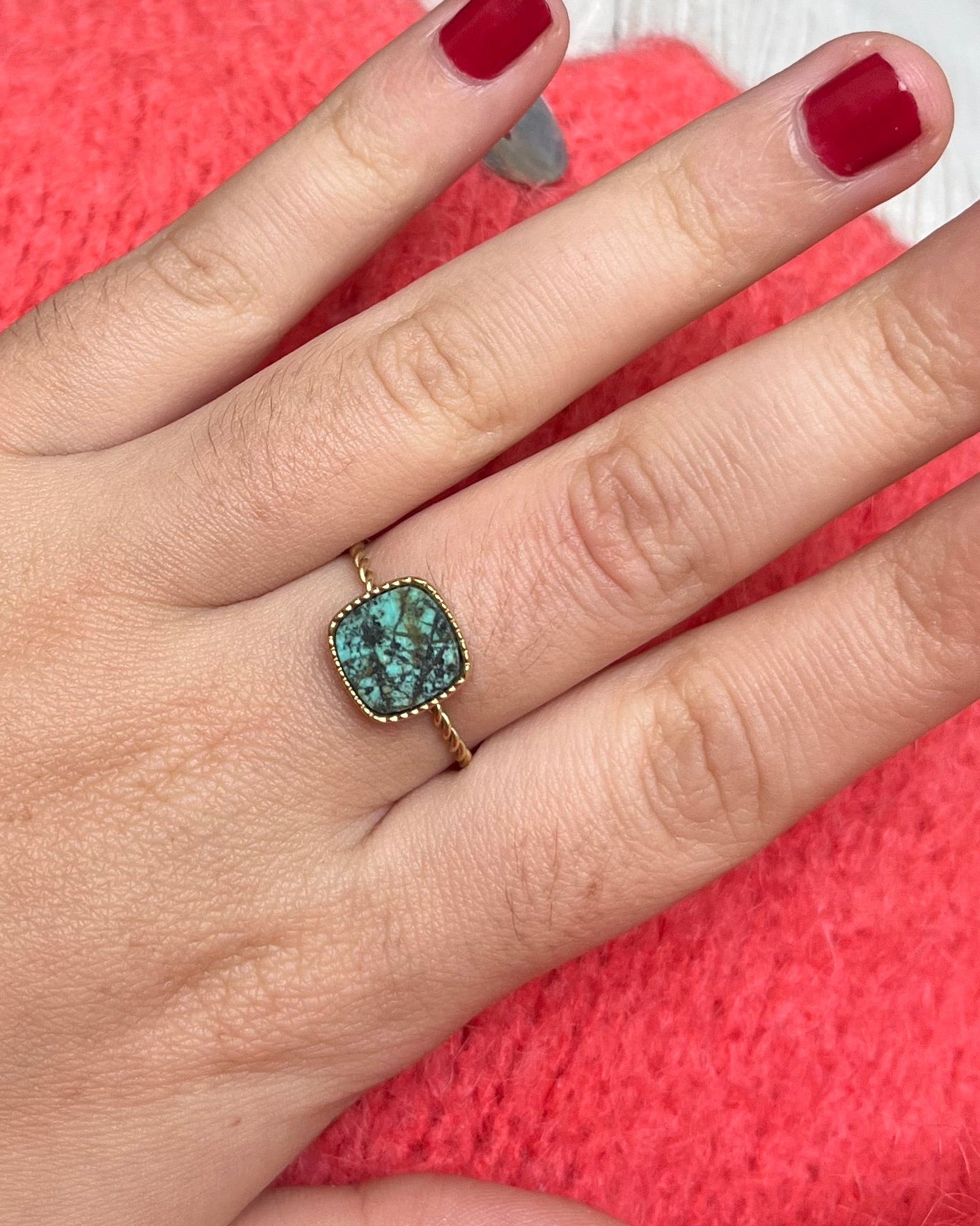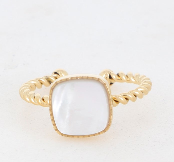 Apportez une touche de raffinement et d’originalité avec cette bague en acier inoxydable doré, composée d’un anneau torsadé élégant et d’une pierre naturelle carrée délicatement sertie. Son design allie modernité et féminité, pour un bijou à la fois discret et remarquable.