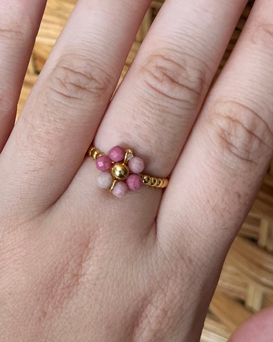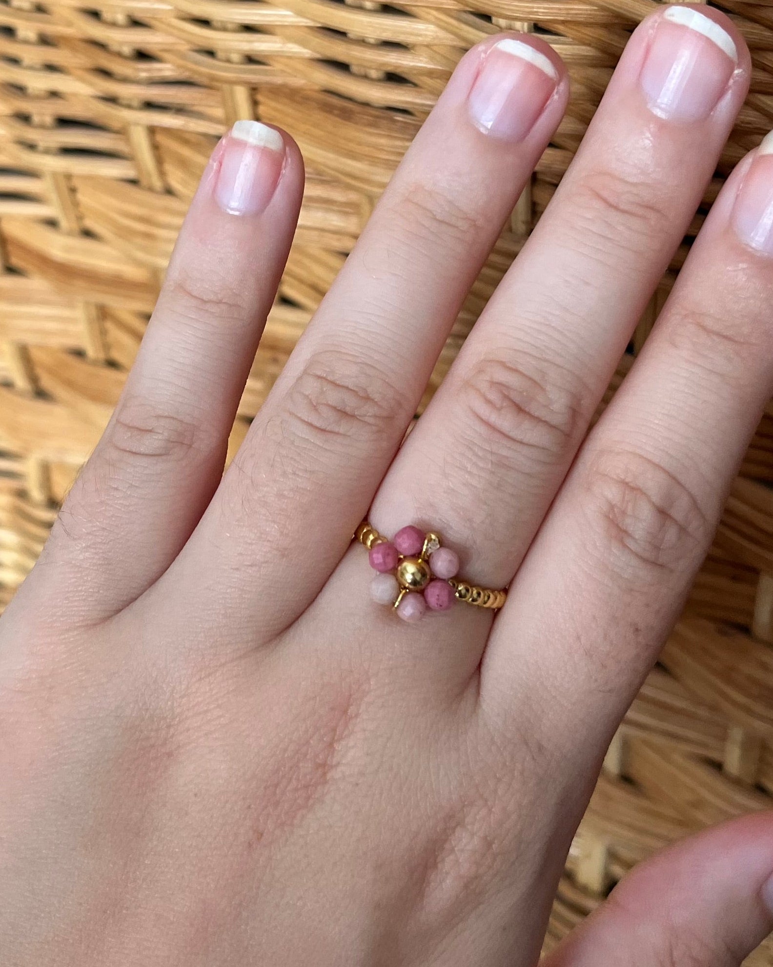 Une bague délicate et féminine, ornée d’une fleur composée de perles roses tout en douceur, posée sur un anneau doré lumineux.