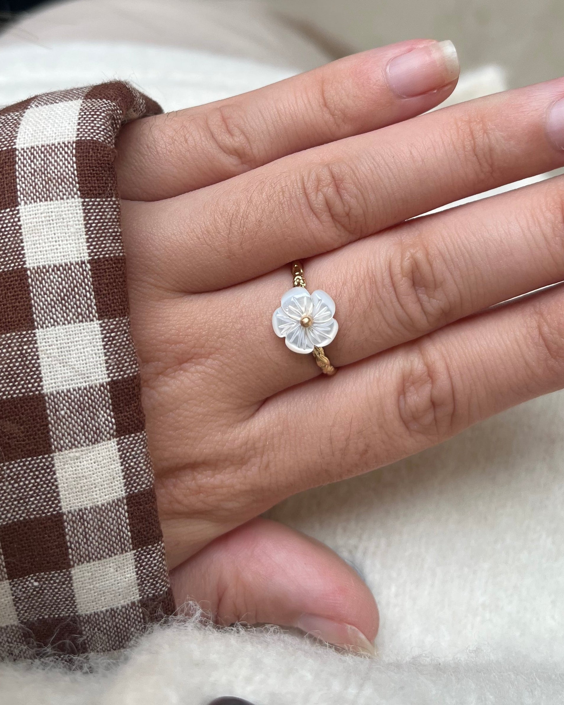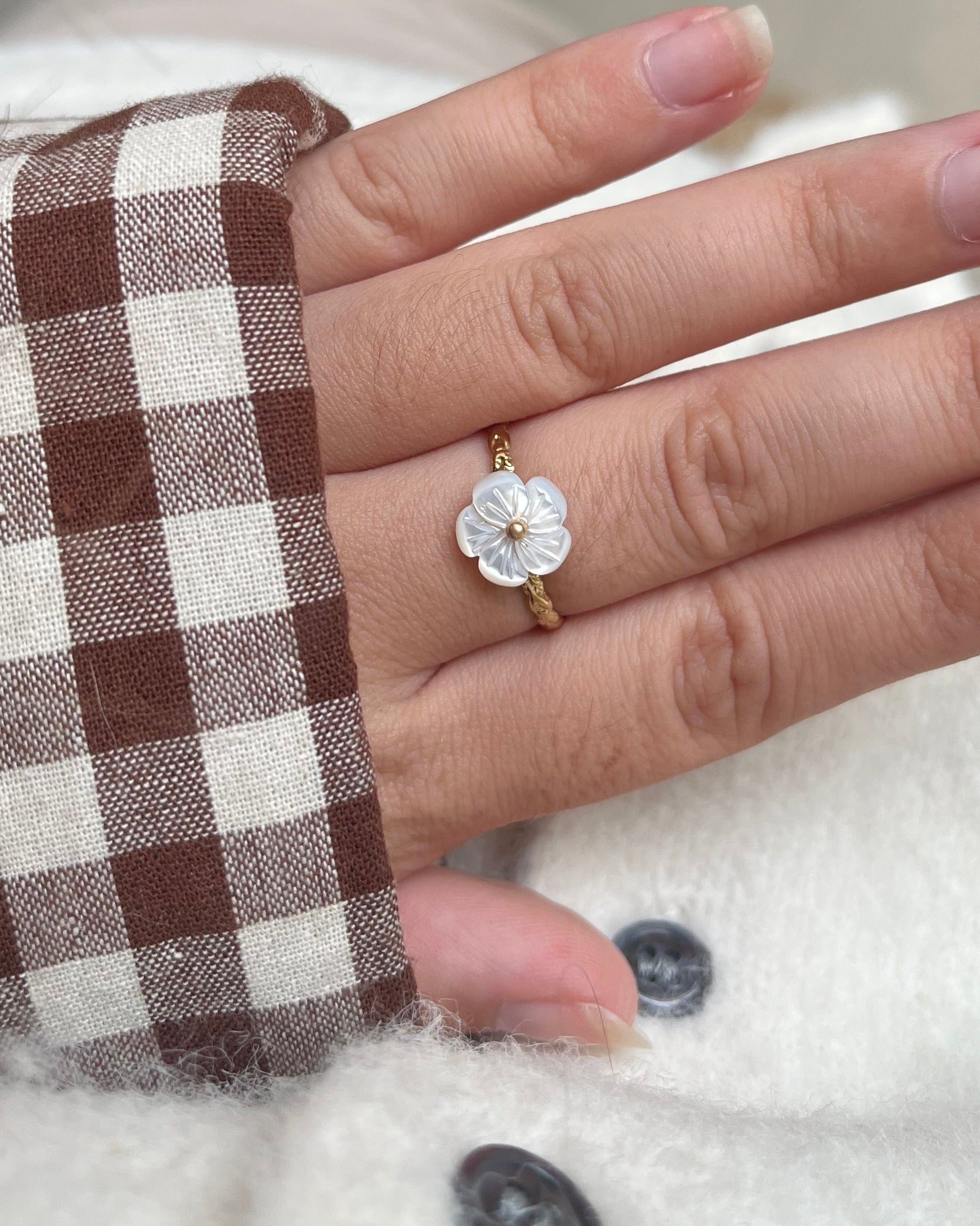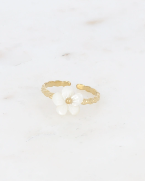 Apportez une touche de douceur et de féminité à votre look avec cette superbe bague ornée d’une fleur en nacre. Ses reflets délicats captent la lumière avec élégance, créant un effet lumineux et raffiné à chaque mouvement. Montée sur un anneau doré ajustable, elle s’adapte parfaitement à votre doigt tout en ajoutant une note romantique et naturelle à vos tenues.