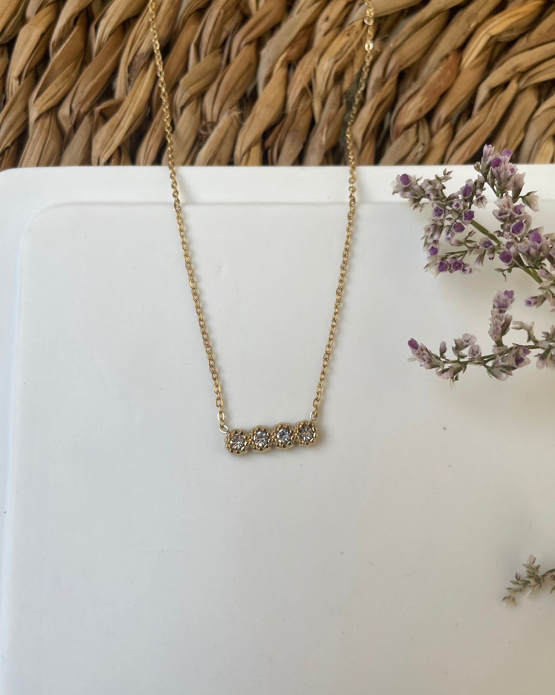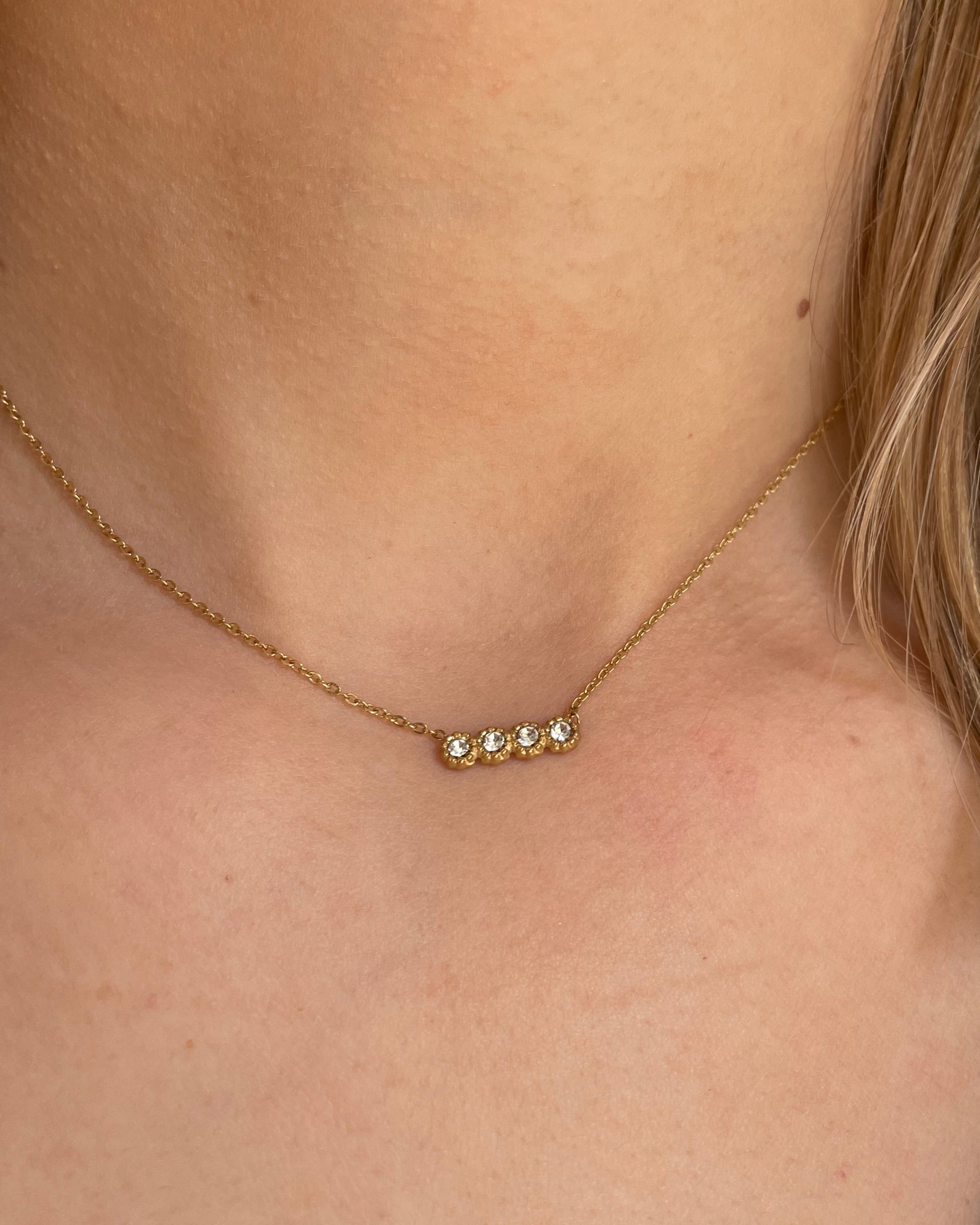 Élégance et simplicité se rencontrent dans ce collier délicat, orné de quatre strass lumineux. Chaque strass, soigneusement placé sur une chaîne fine dorée, capte la lumière de manière subtile mais brillante, créant un effet scintillant qui rehausse toute votre tenue. Ce collier est une pièce minimaliste mais pleine de charme, idéale pour apporter une touche de sophistication discrète..