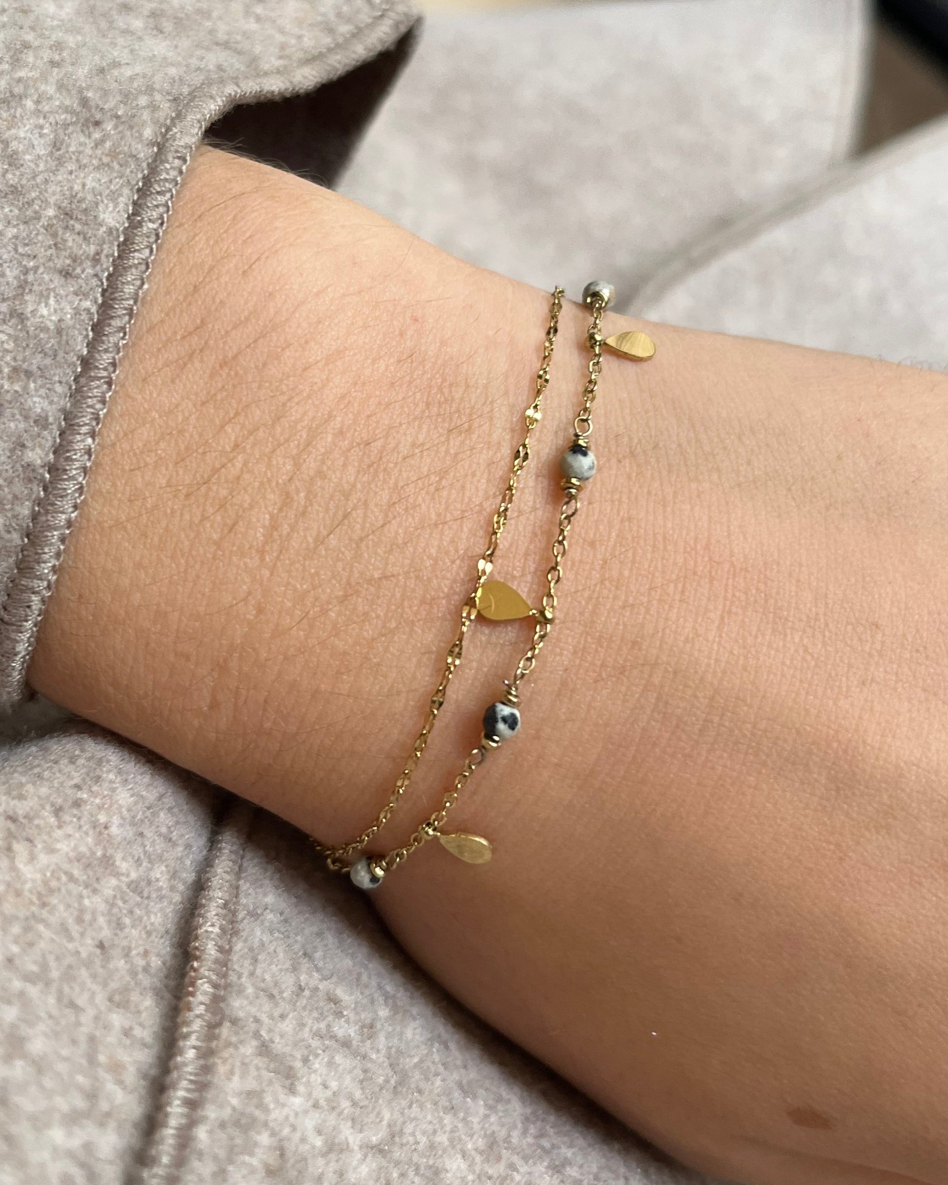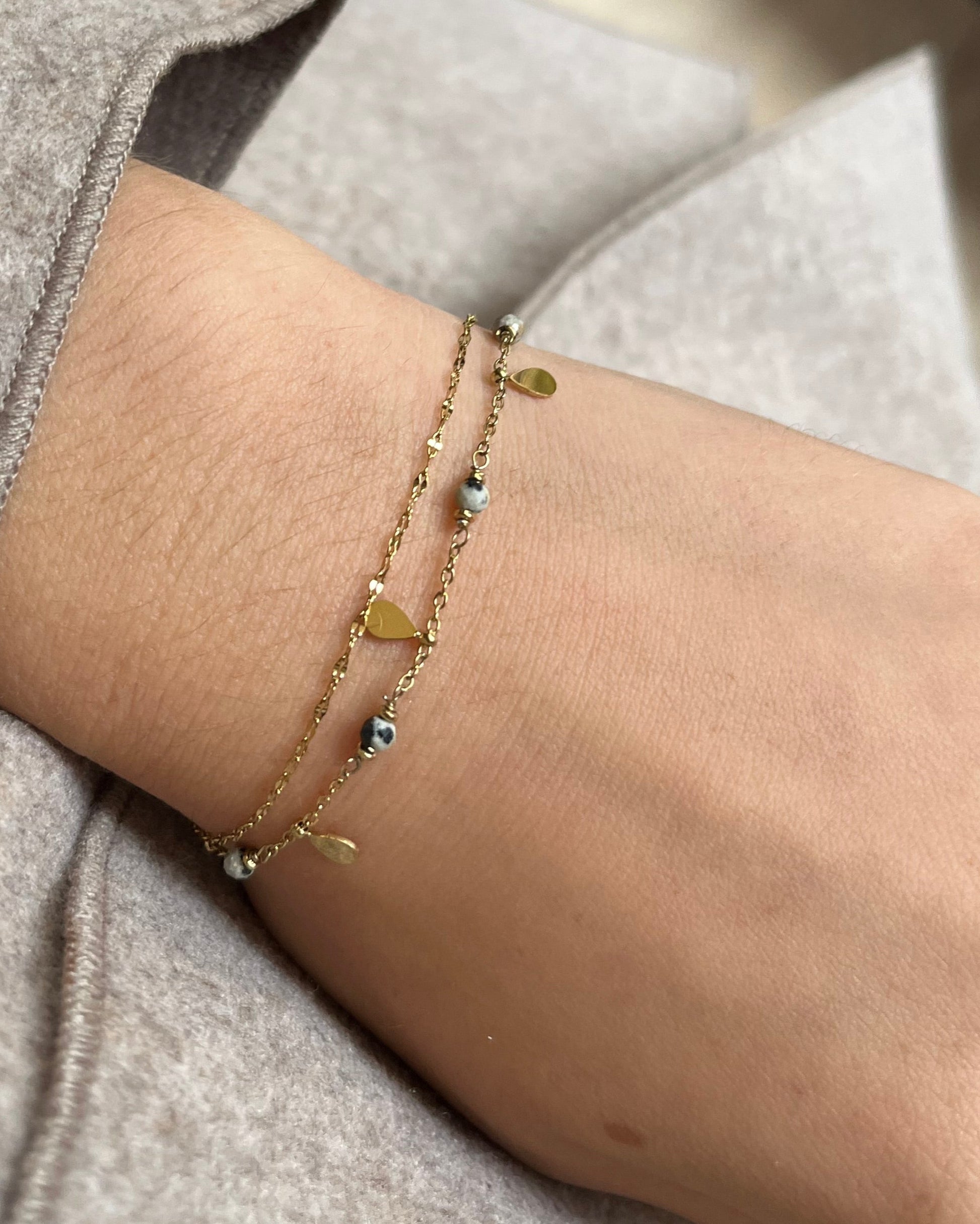 Apportez une touche raffinée et naturelle à vos tenues avec ce bracelet doré , doté d’une maille café plat élégante, de pampilles en forme de goutte et de pierres naturelles délicates. Son design féminin et subtil en fait un bijou parfait pour le quotidien comme pour vos occasions spéciales. Un accessoire chic et intemporel qui sublime votre style avec élégance.
