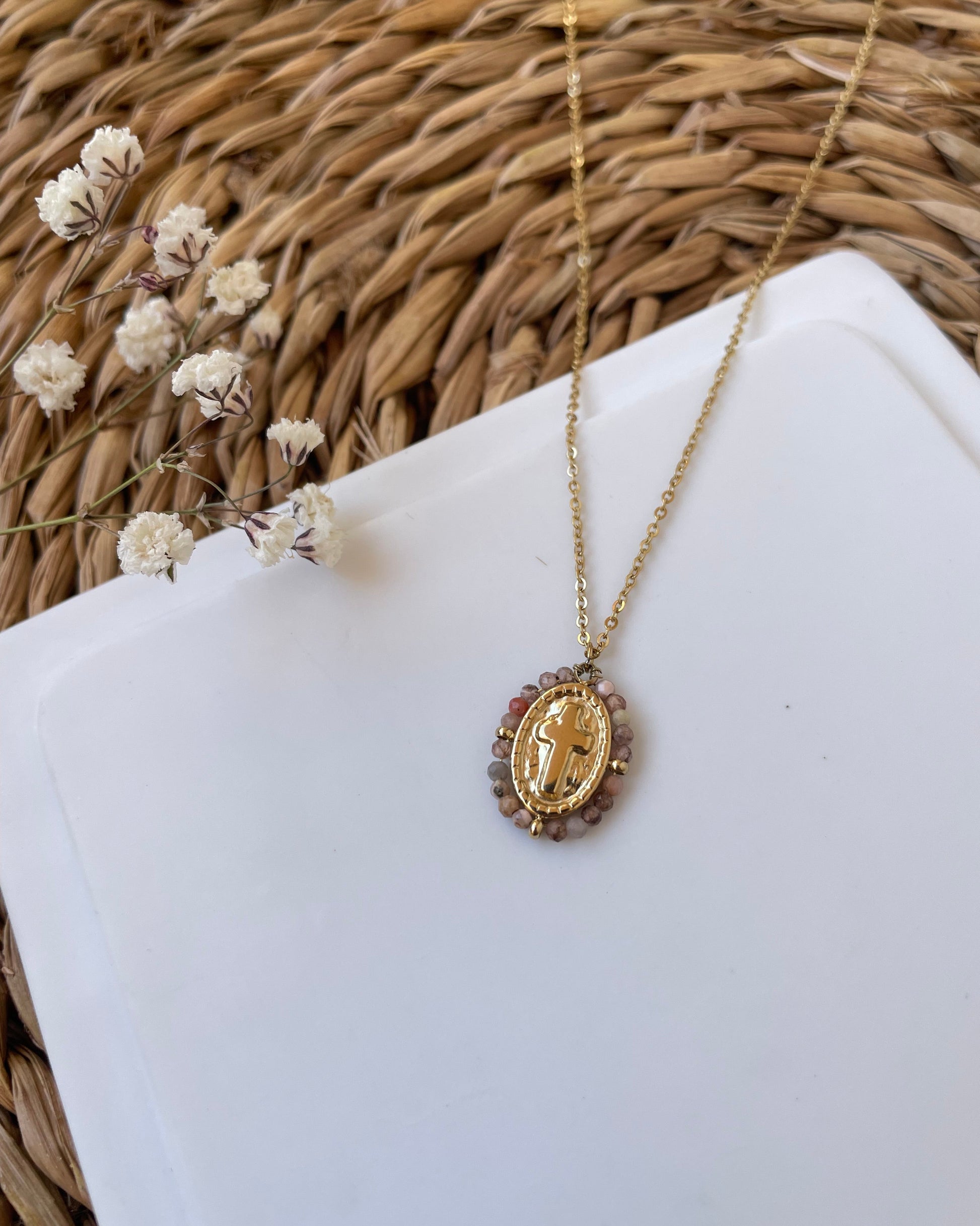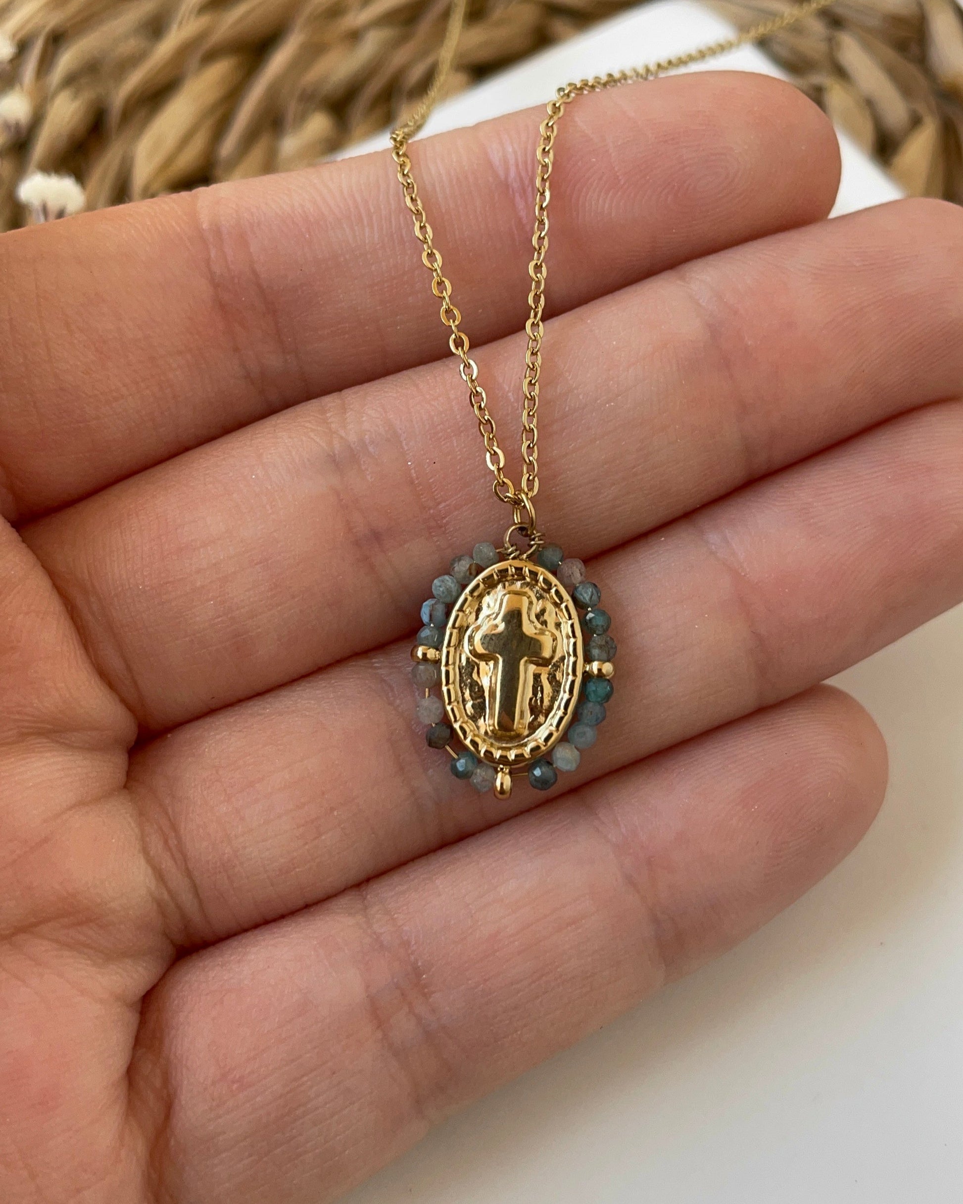 Sublimez votre style avec notre collier médaillon croix, une pièce intemporelle alliant élégance et symbolisme. Son pendentif en acier inoxydable doré met en valeur une délicate croix chrétienne, entourée d’un halo de pierres naturelles soigneusement sélectionnées pour leur éclat et leurs vertus.