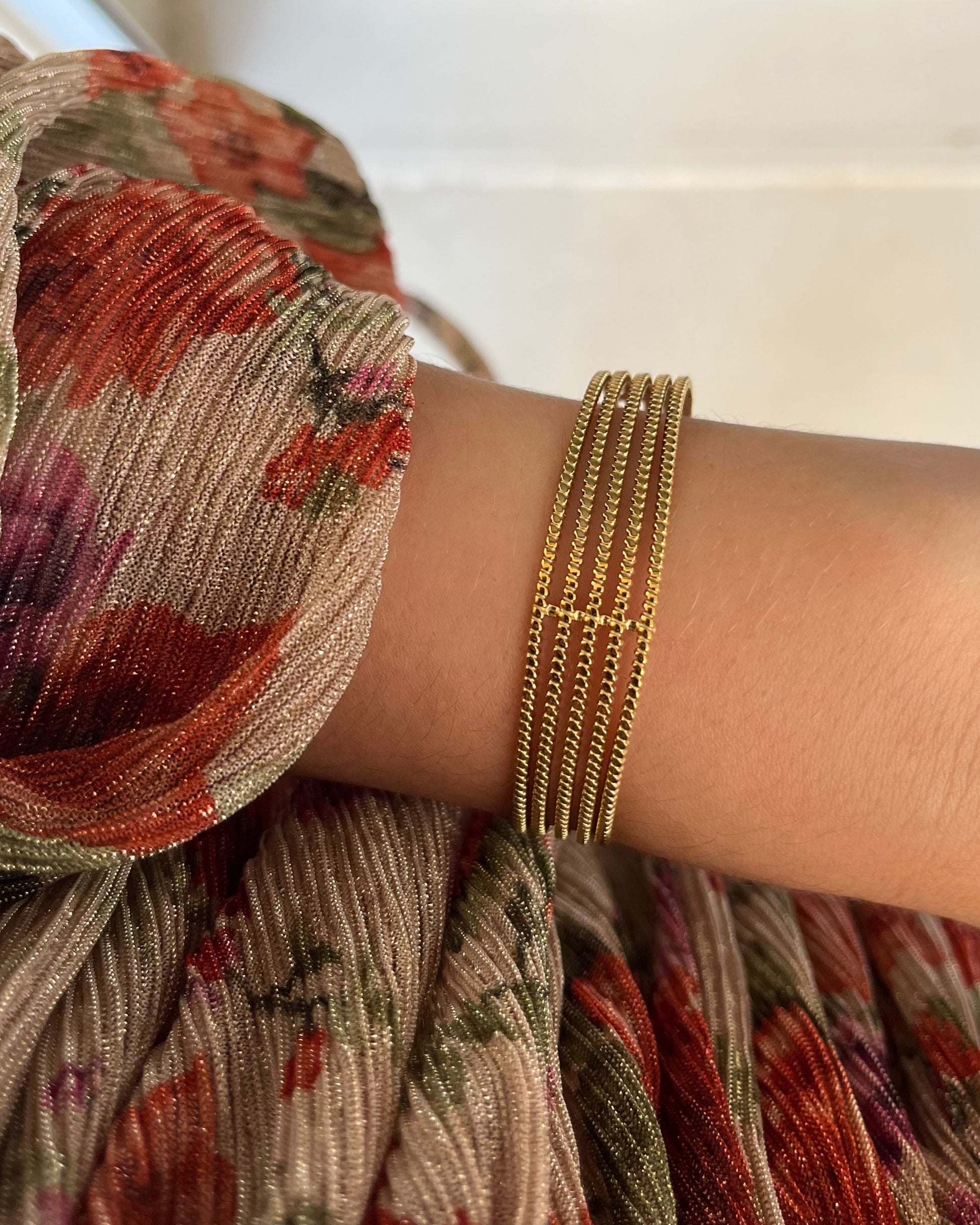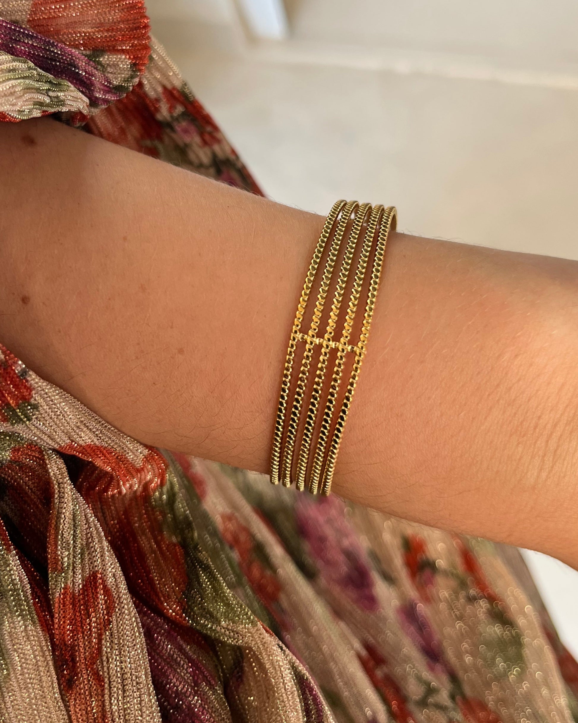 Un bracelet jonc ouvert au design moderne, orné de plusieurs rangs de petits ronds dorés en métal qui jouent avec la lumière.