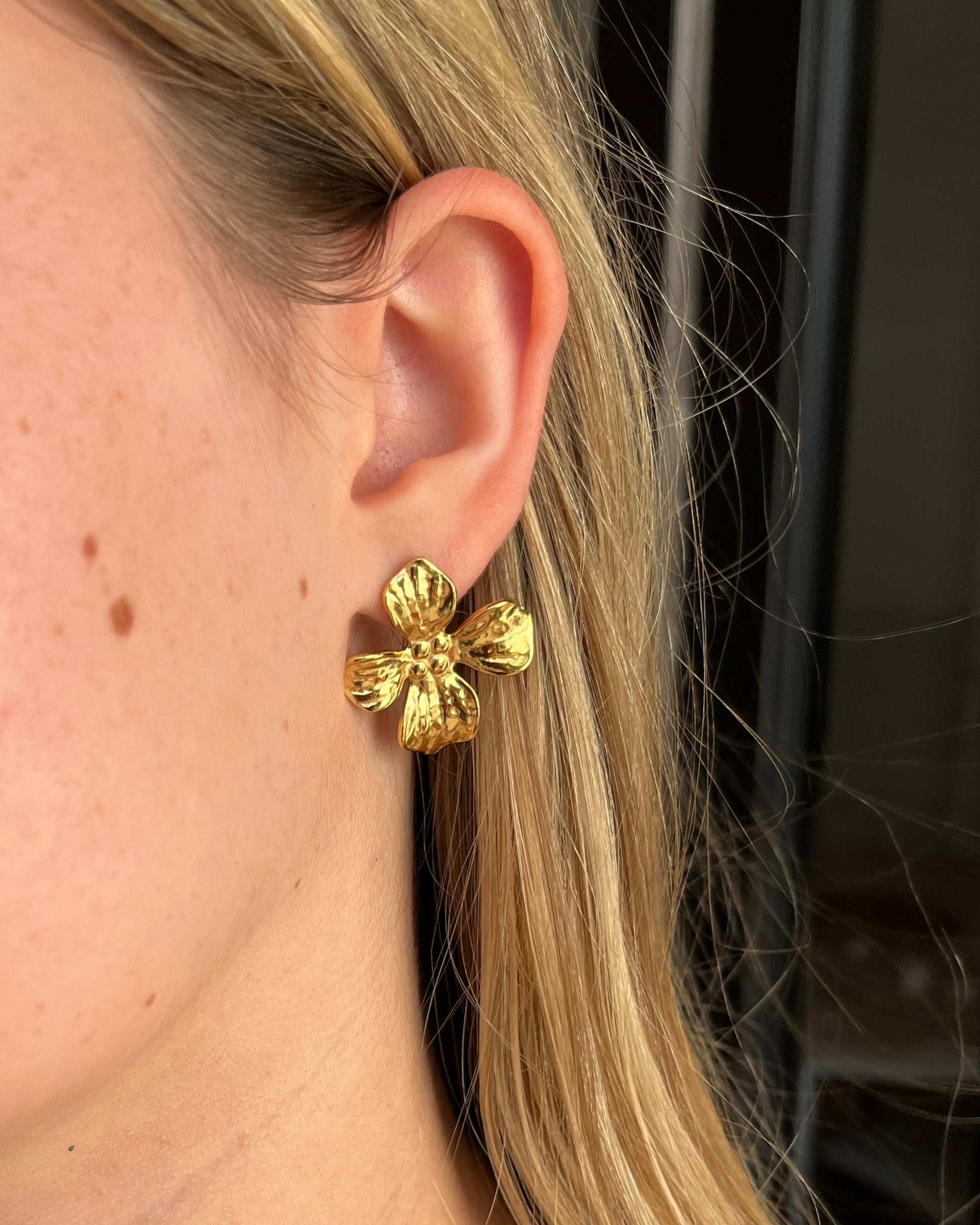 Des boucles d’oreilles pleines de douceur et de lumière, en forme de fleur stylisée, entièrement dorées.