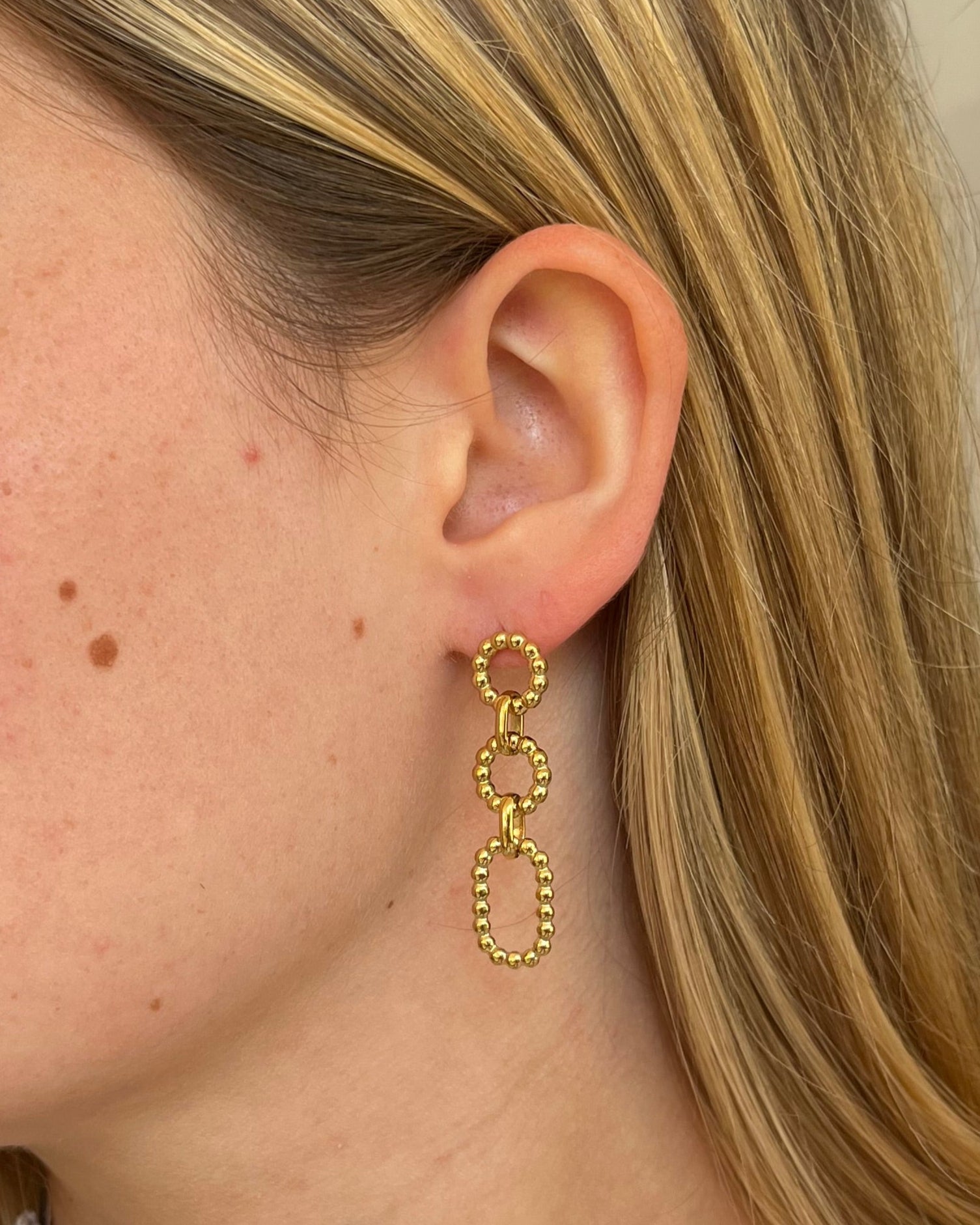 Apportez une touche d’élégance graphique à vos tenues avec ces boucles d’oreilles au design géométrique raffiné. Composées de deux cercles entrelacés et d’un petit ovale délicatement suspendu, elles jouent sur les formes et les volumes pour créer un équilibre subtil entre minimalisme et originalité.