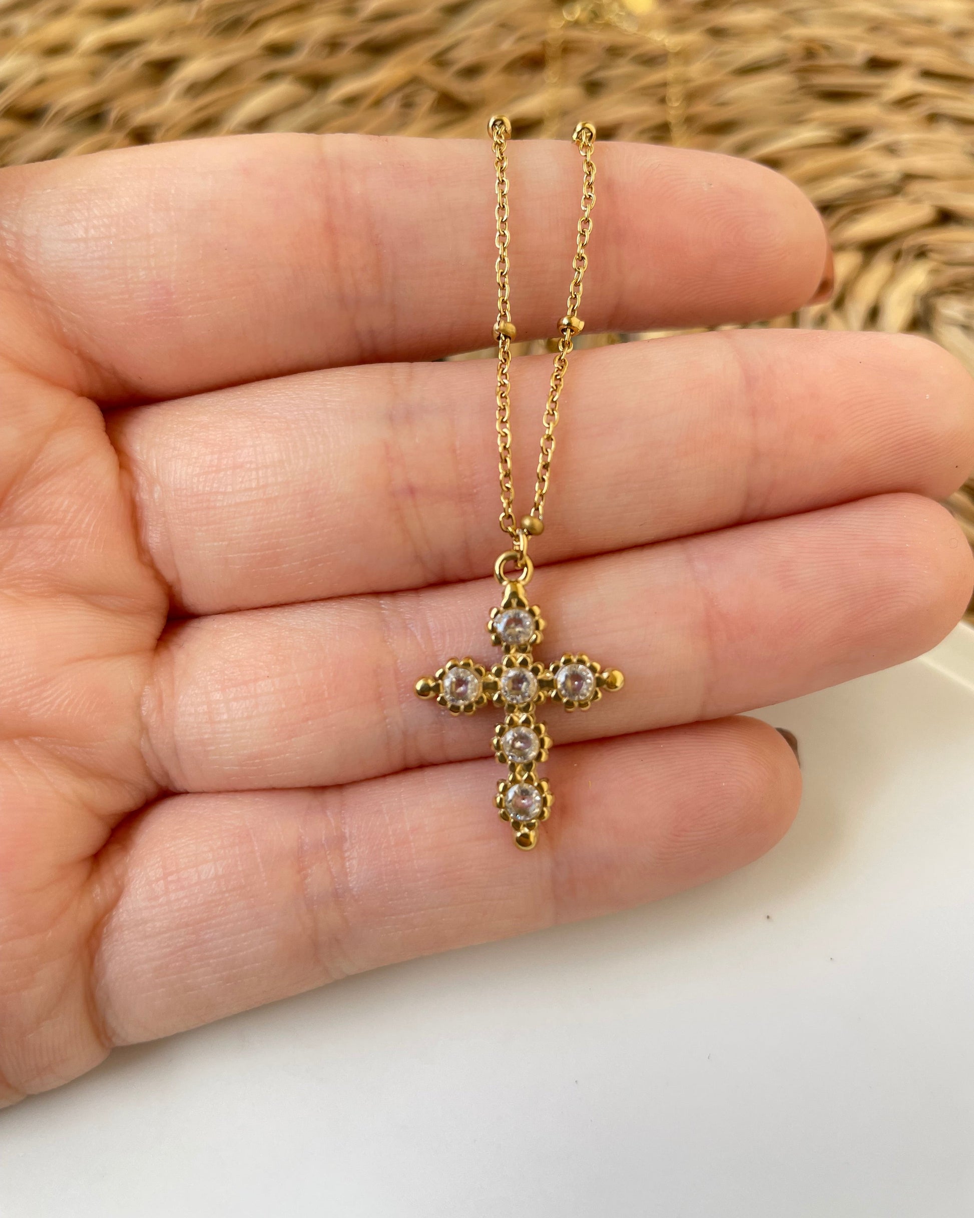 Ce collier incarne l’élégance et la spiritualité avec une touche raffinée. Son pendentif en forme de croix chrétienne est sublimé par de délicats strass scintillants. Suspendue à une fine chaîne en acier inoxydable doré, cette pièce intemporelle symbolise la foi, la protection et la grâce.