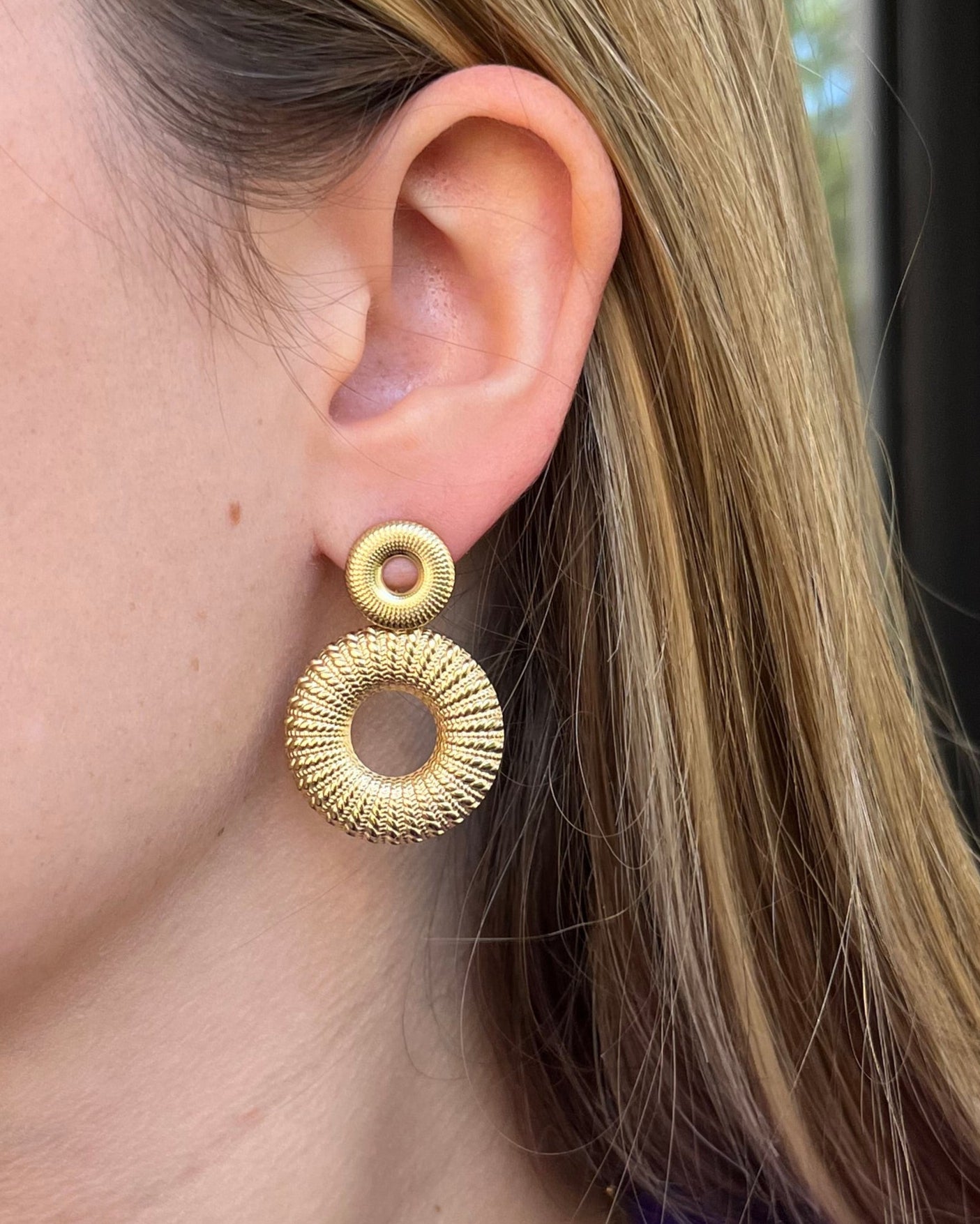 Apportez une touche moderne et élégante à vos tenues avec ces boucles d’oreilles pendantes en acier inoxydable, composées de deux cercles larges et texturés. Leur design graphique et raffiné en fait un bijou chic et intemporel, parfait pour sublimer votre regard et apporter de la présence à vos occasions spéciales comme au quotidien.