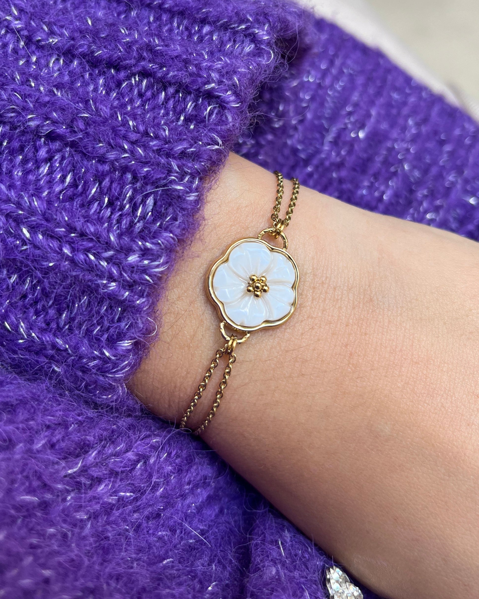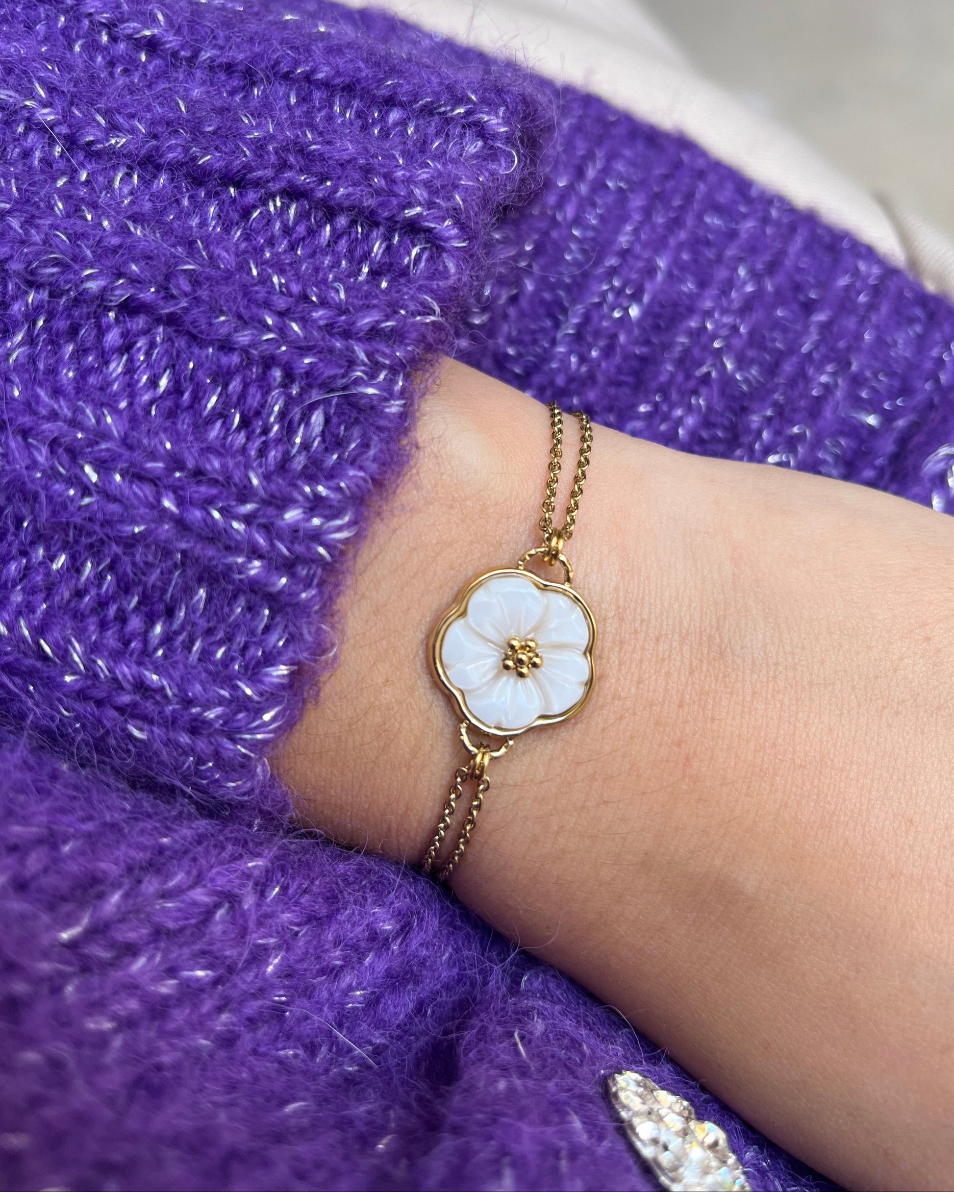 Mettez en valeur votre poignet avec ce bracelet sur chaîne en acier inoxydable, sublimé par une grande pièce en forme de fleur nacrée. À la fois délicat et raffiné, ce bijou intemporel apporte une touche féminine et élégante à toutes vos tenues, du quotidien aux occasions spéciales.