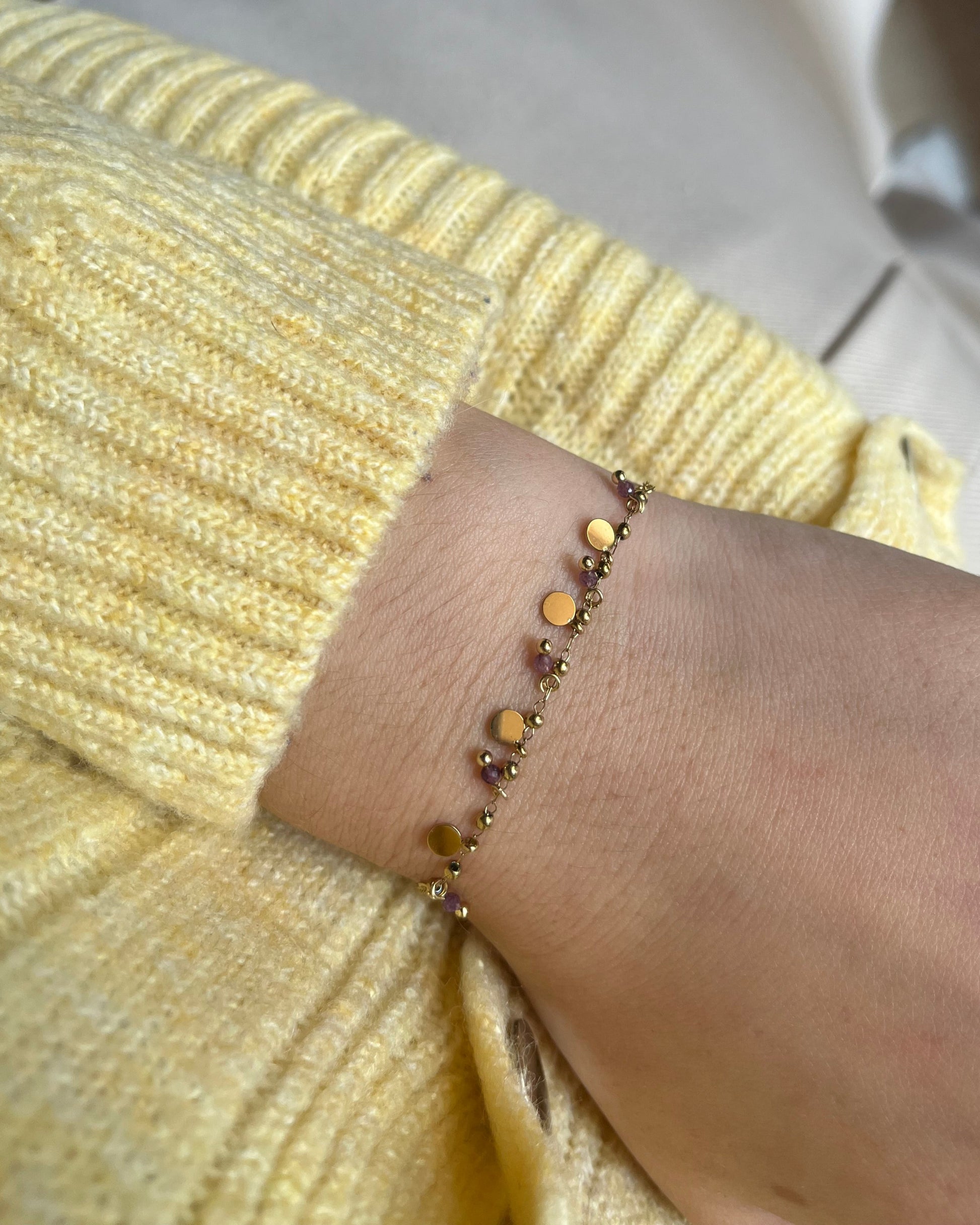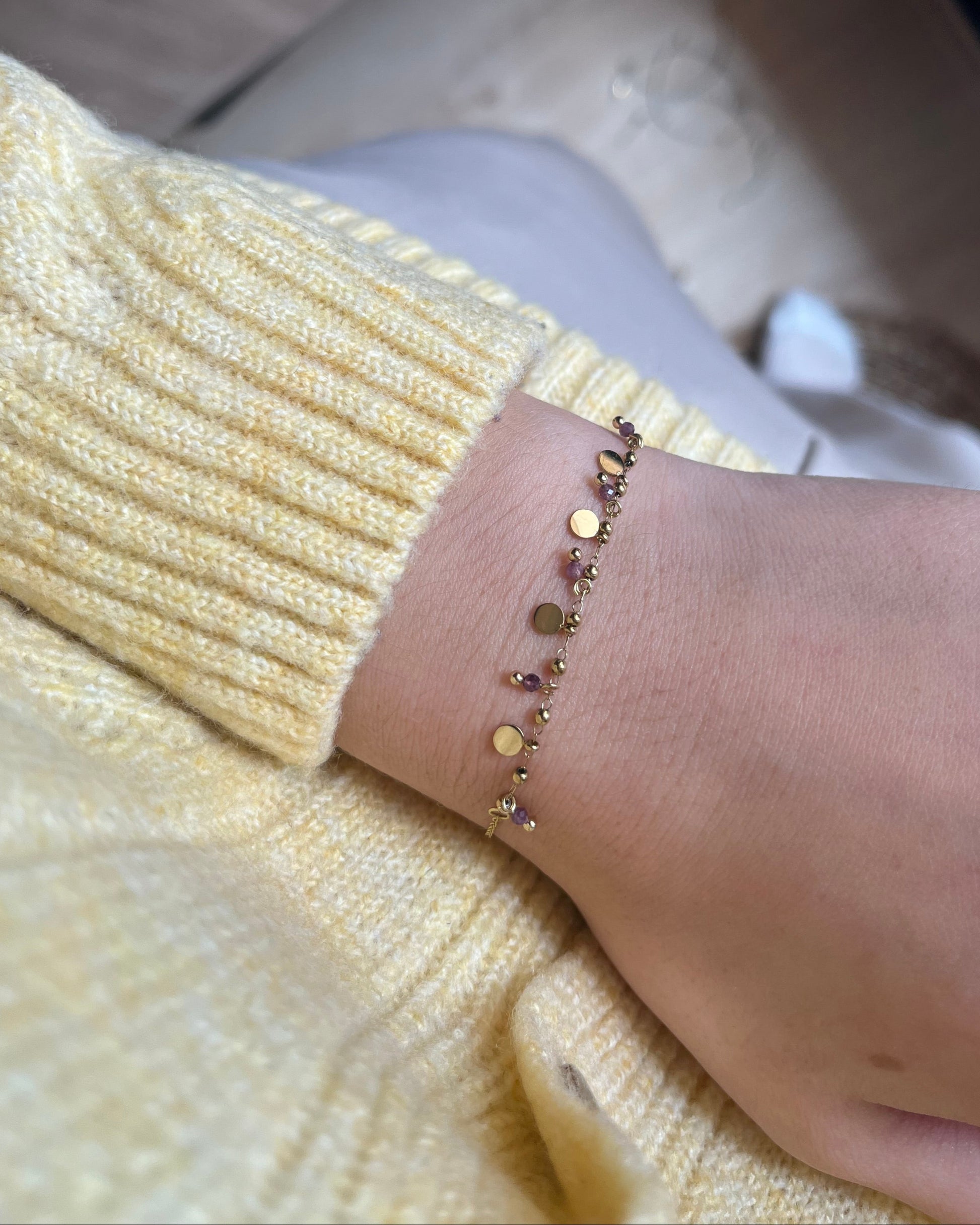 Ce bracelet doré joue avec la délicatesse de plusieurs pampilles dorées, qui dansent avec les pierres naturelles violettes aux nuances profondes. Une alliance harmonieuse entre l’éclat chaleureux du métal et la sophistication mystérieuse des pierres, pour un bijou à la fois raffiné, original et plein de charme. Parfait pour illuminer le poignet avec élégance et mouvement.