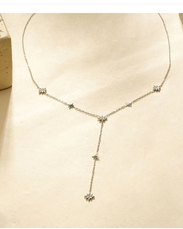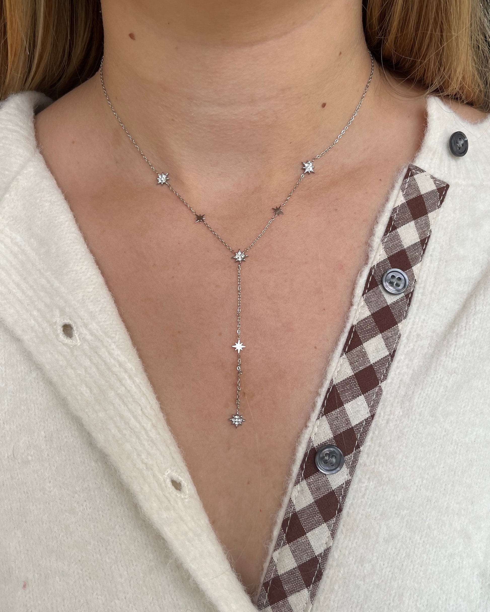 Ce collier argenté fin séduit par son style sautoir délicat et ses détails étincelants. Orné de petites étoiles lisses et strassées, il reflète la lumière avec subtilité et élégance. Sa chaînette pendante sertie de strass apporte une touche raffinée et féminine, idéale pour sublimer un décolleté.