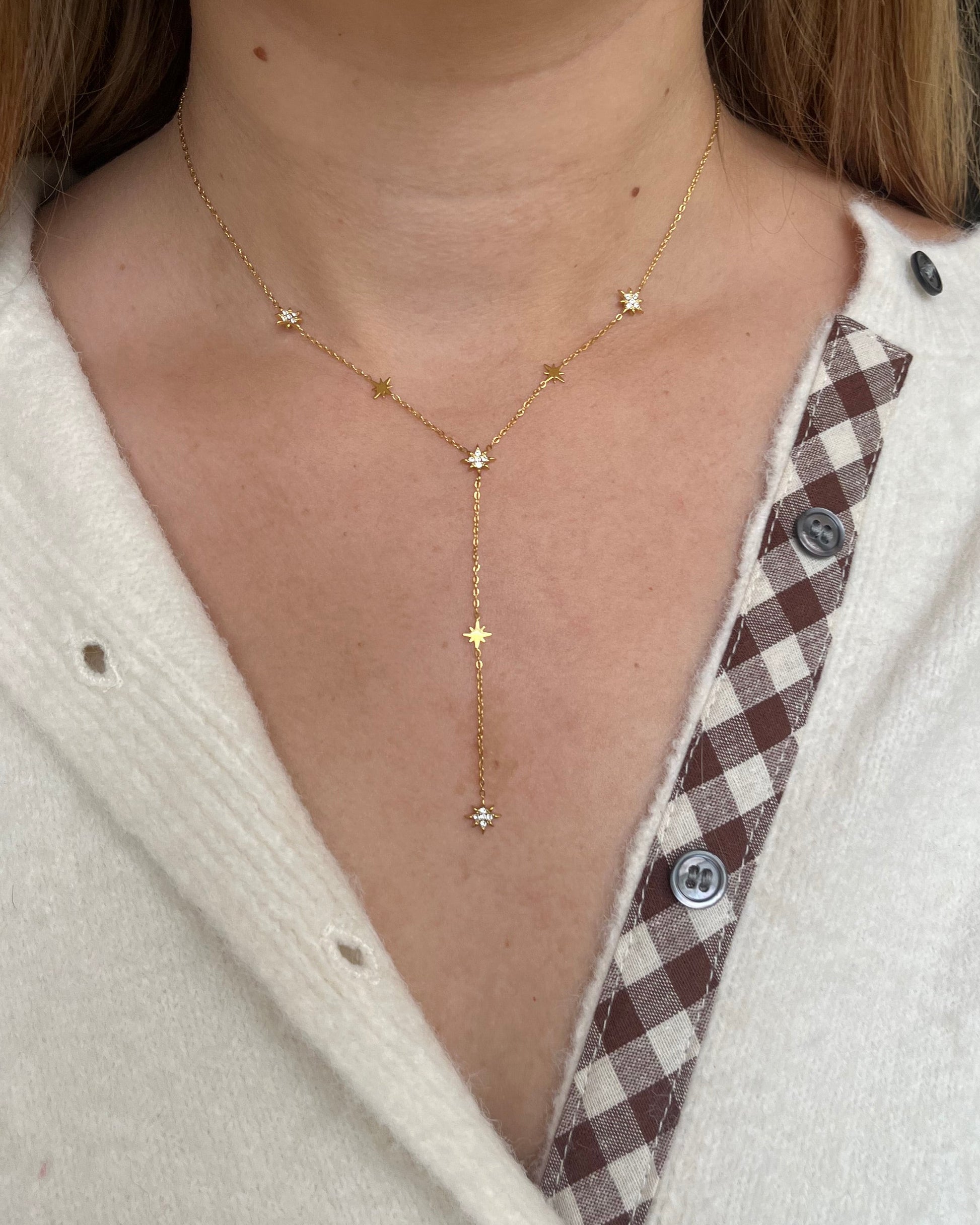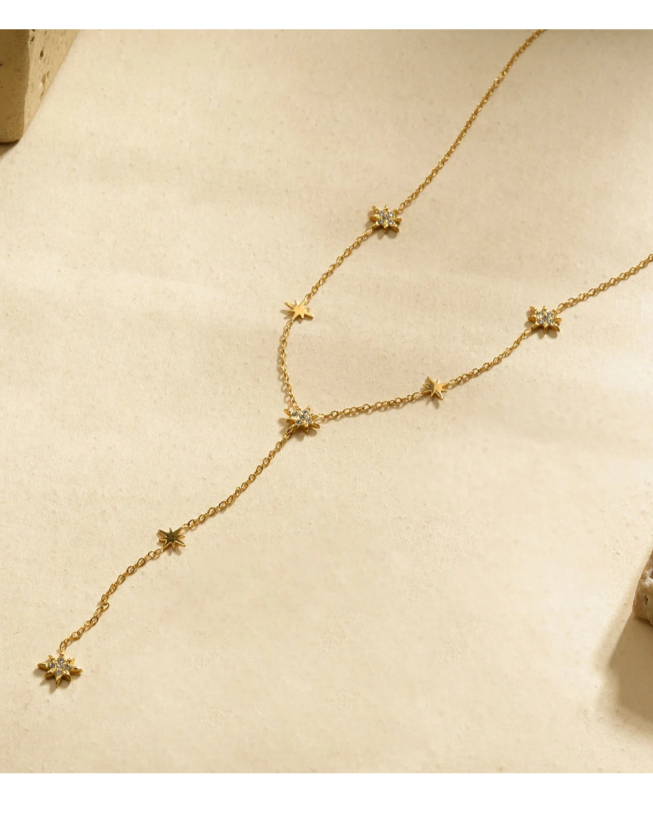 Ce collier doré fin séduit par son style sautoir délicat et ses détails étincelants. Orné de petites étoiles lisses et strassées, il reflète la lumière avec subtilité et élégance. Sa chaînette pendante sertie de strass apporte une touche raffinée et féminine, idéale pour sublimer un décolleté.
