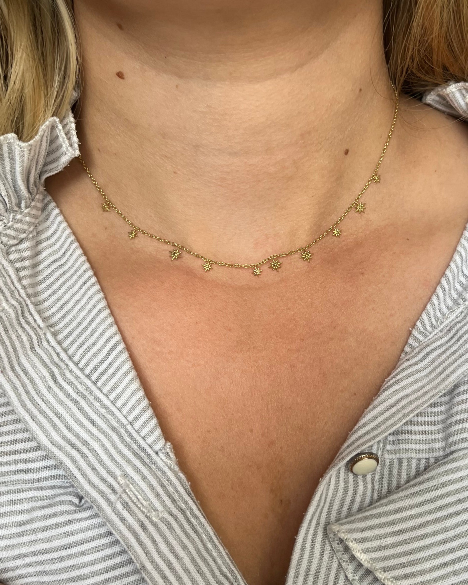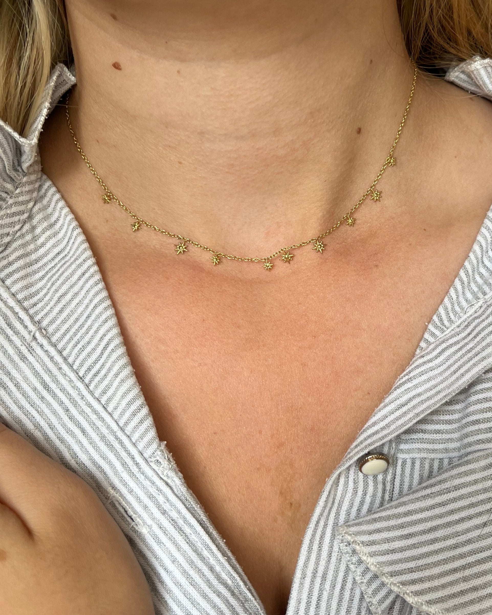 Laissez-vous séduire par ce collier délicat orné de petites étoiles en breloque, parfait pour illuminer votre cou d’une touche poétique et féminine. Chaque étoile capte la lumière avec subtilité, apportant un éclat discret mais irrésistible à votre tenue.