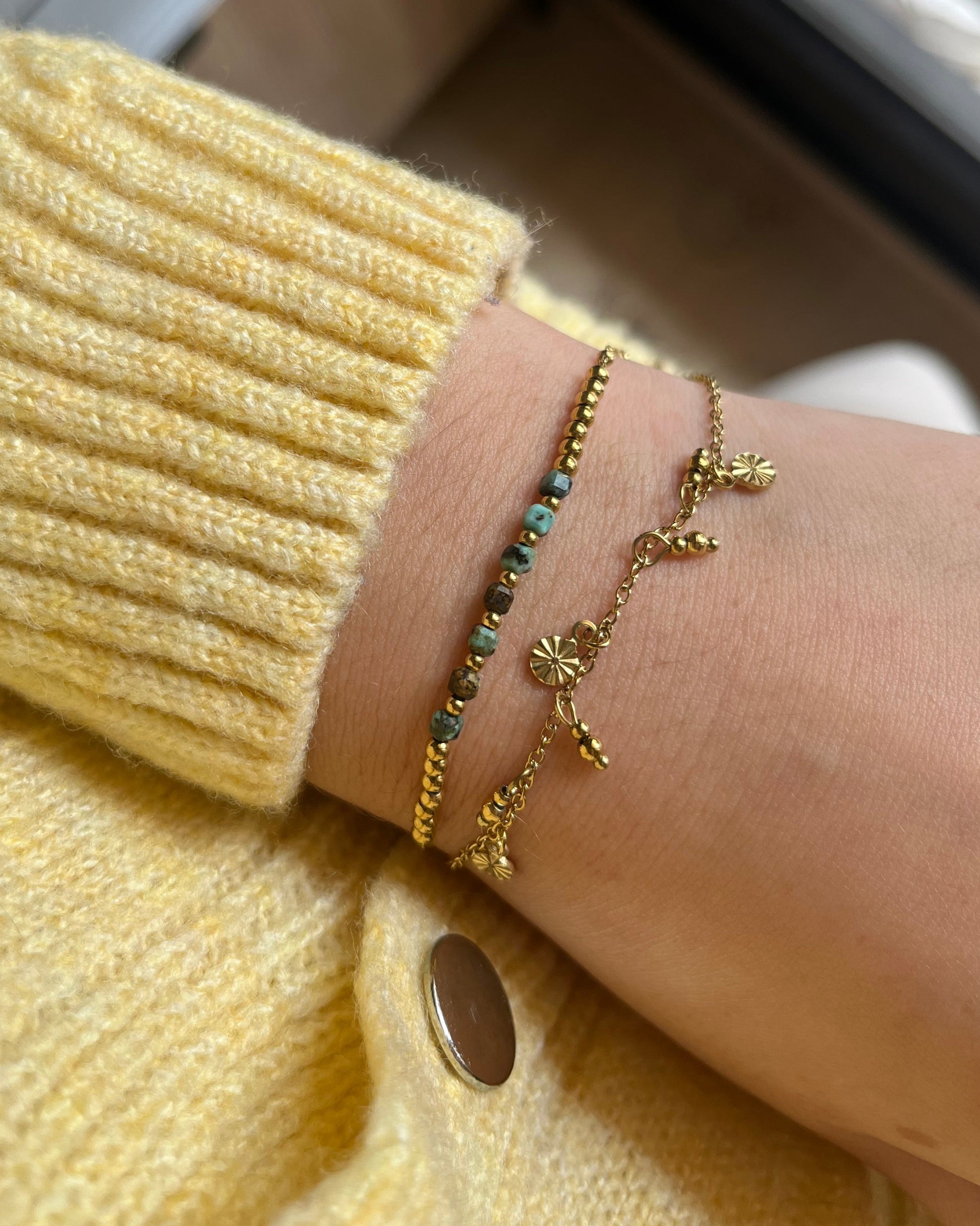 Ce bracelet double rang allie la fraîcheur de perles colorées à l’élégance d’une chaîne dorée délicate. Plusieurs breloques fines viennent ponctuer le bijou avec légèreté, apportant une touche à la fois symbolique et solaire.