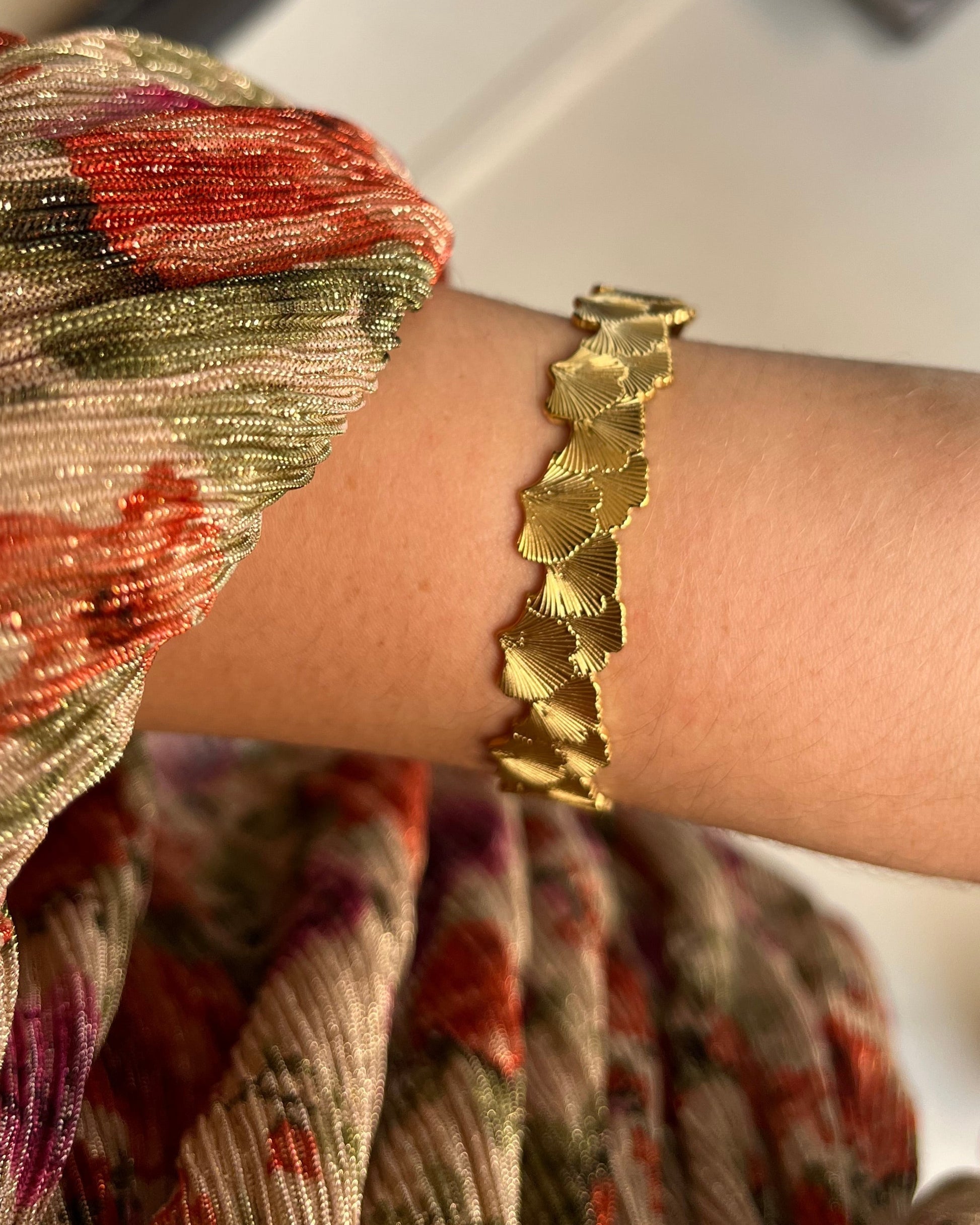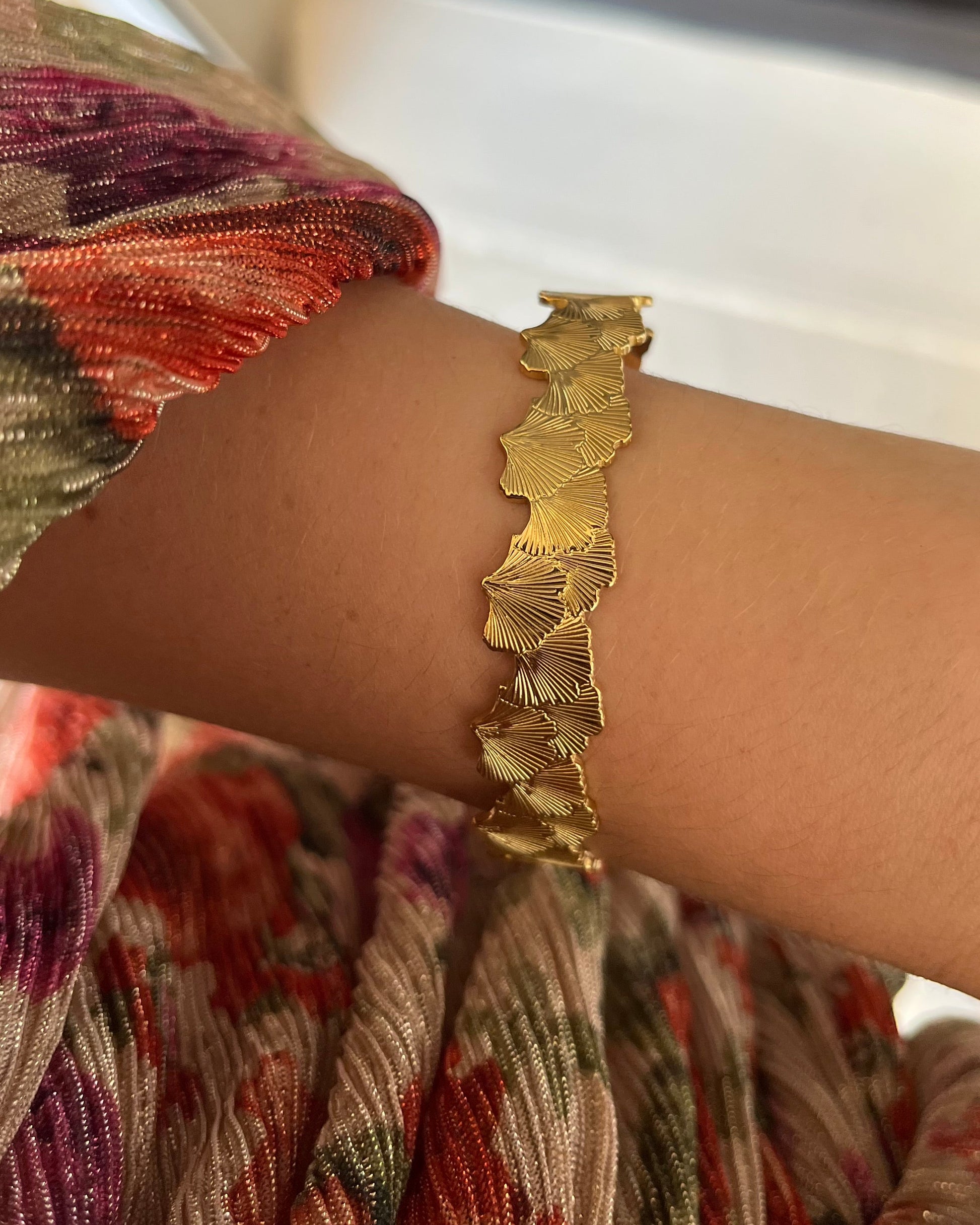 Une manchette unique, parée d’un bouquet de fleurs de ginkgo finement sculptées en relief sur un métal doré éclatant.