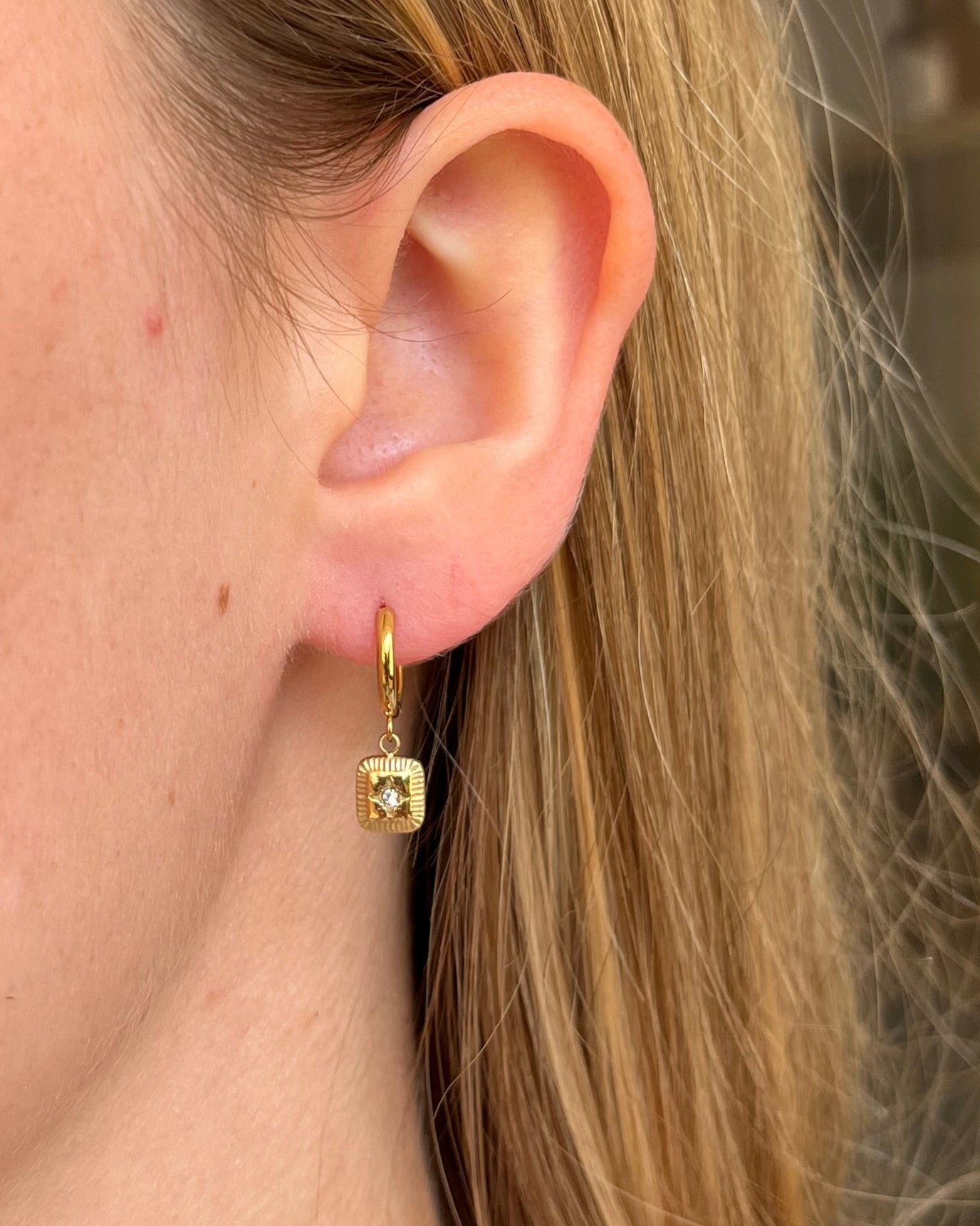 Ces petites créoles dorées sont sublimées par un pendentif carré orné d’une étoile délicatement gravée au centre, rehaussée d’un oxyde de zirconium étincelant. Un bijou à la fois fin, moderne et légèrement mystique, parfait pour illuminer votre quotidien.