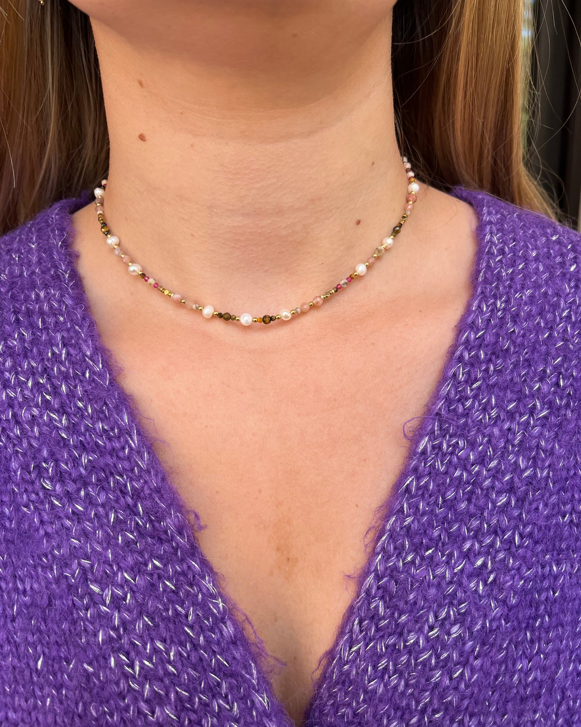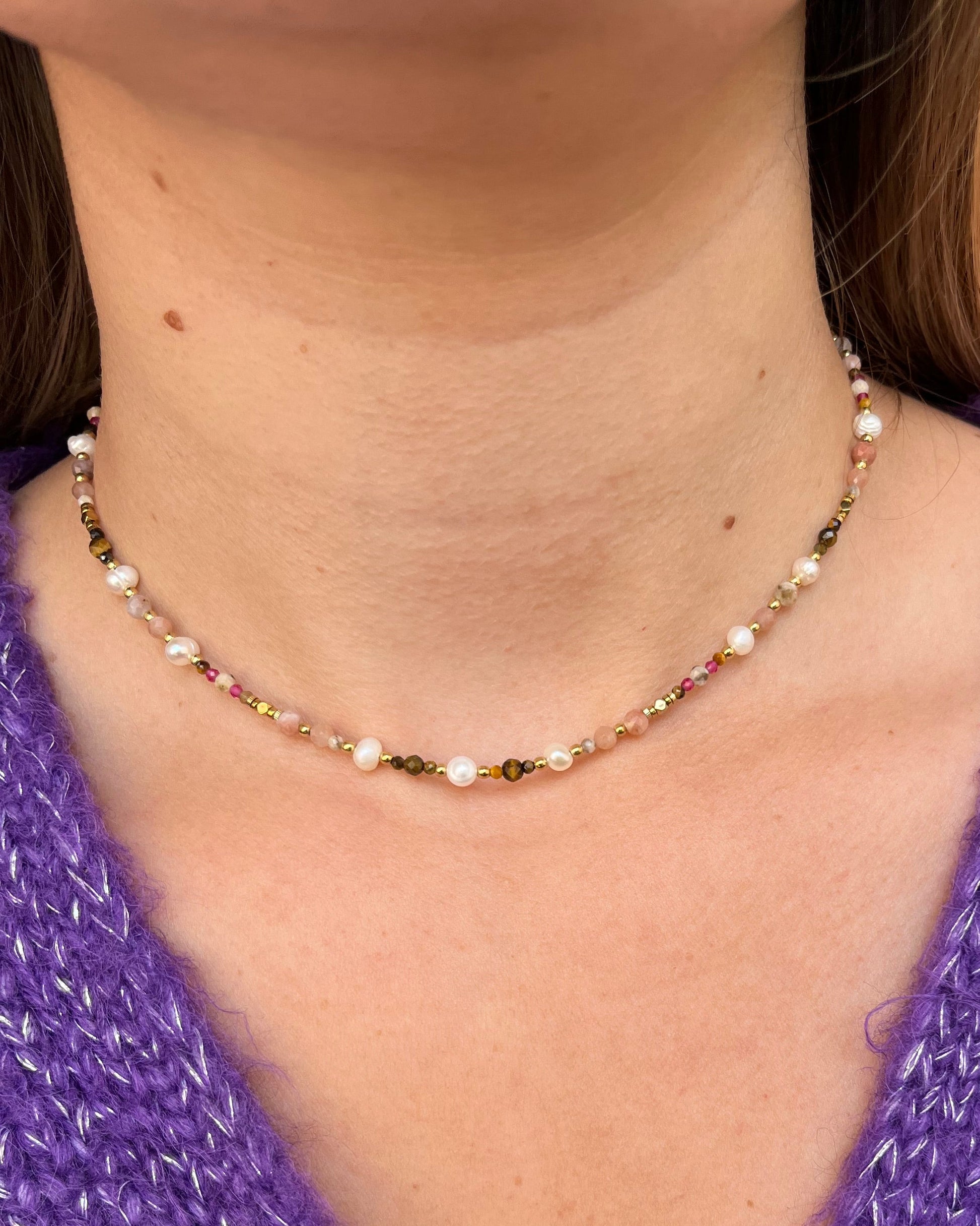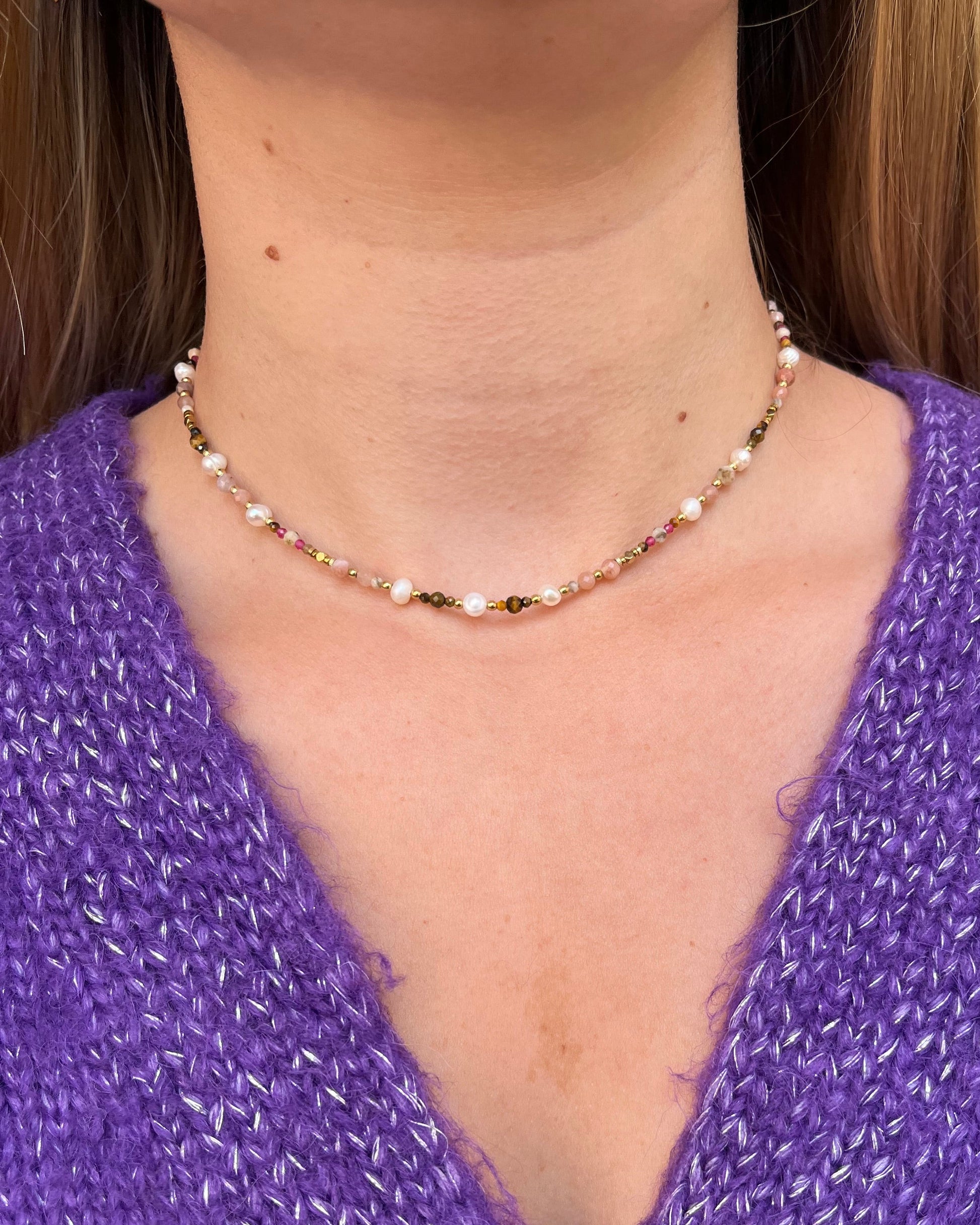 Apportez une note élégante et authentique à vos tenues avec ce collier raffiné, composé de pierres naturelles et de perles d’eau douce. Son mélange harmonieux de matières en fait un bijou féminin et intemporel, facile à porter aussi bien au quotidien que lors de vos occasions spéciales. Un collier chic qui illumine votre décolleté avec délicatesse.