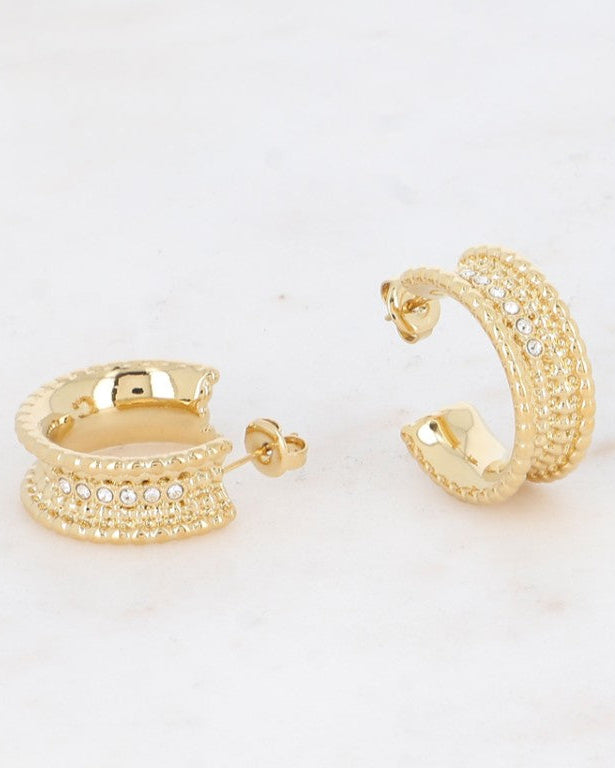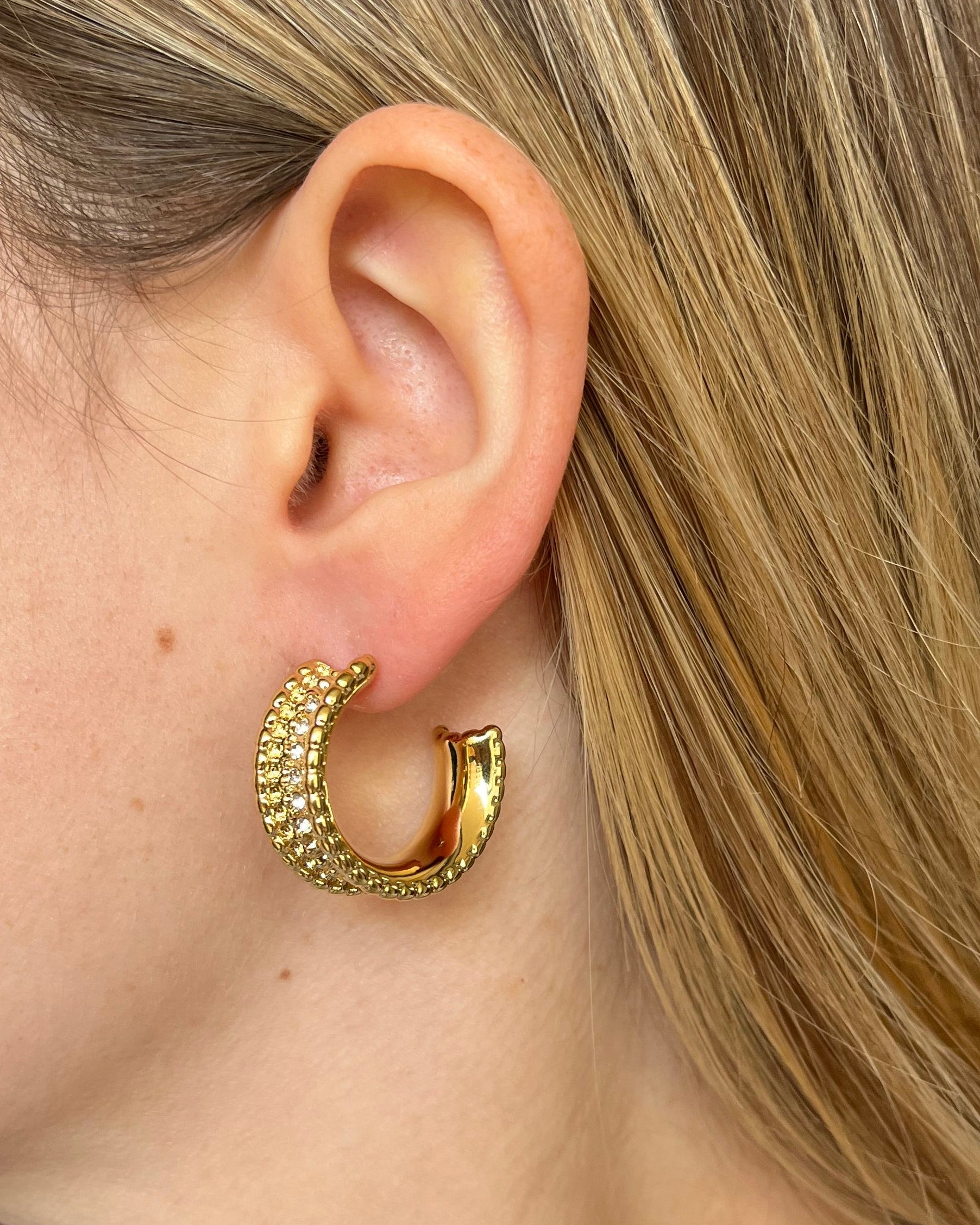 Apportez une touche d’éclat avec ces boucles d’oreilles type créoles en acier inoxydable, composées d’un anneau incurvé et texturé, délicatement serti d’oxydes de zirconium.