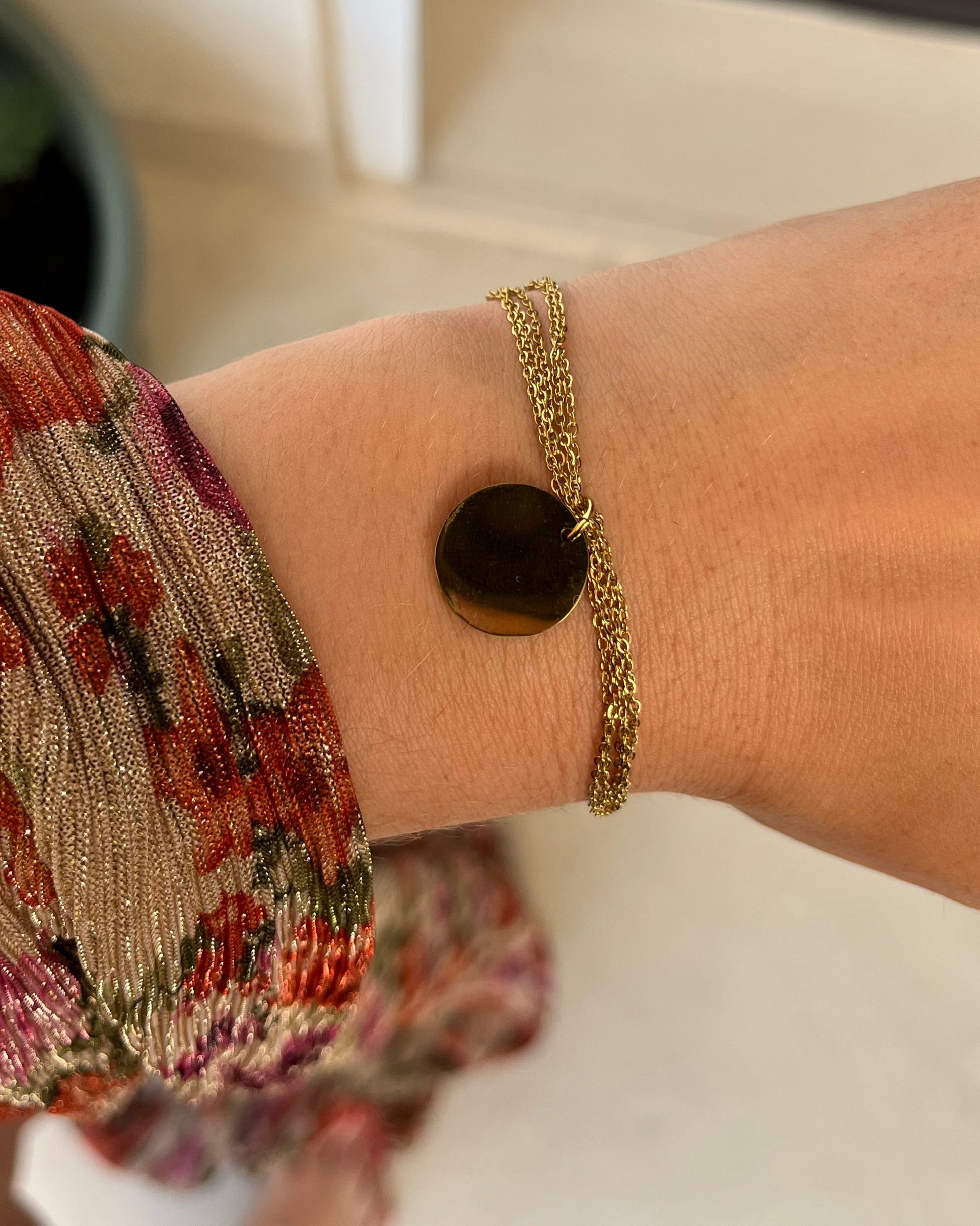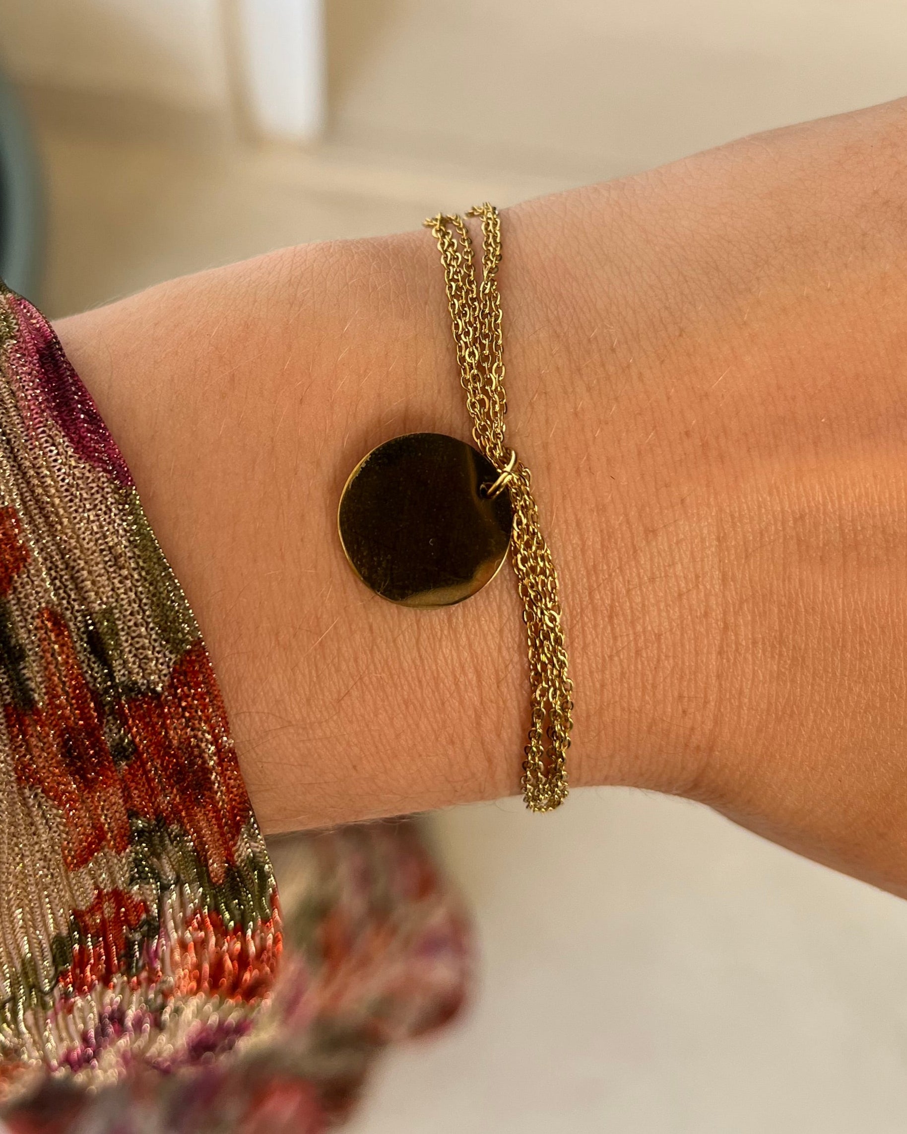 Un bracelet au style affirmé et féminin, composé de plusieurs chaînes fines et d’un médaillon doré qui attire subtilement le regard.