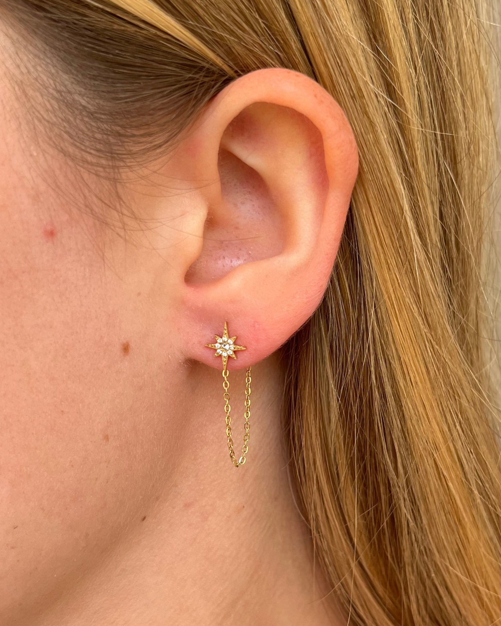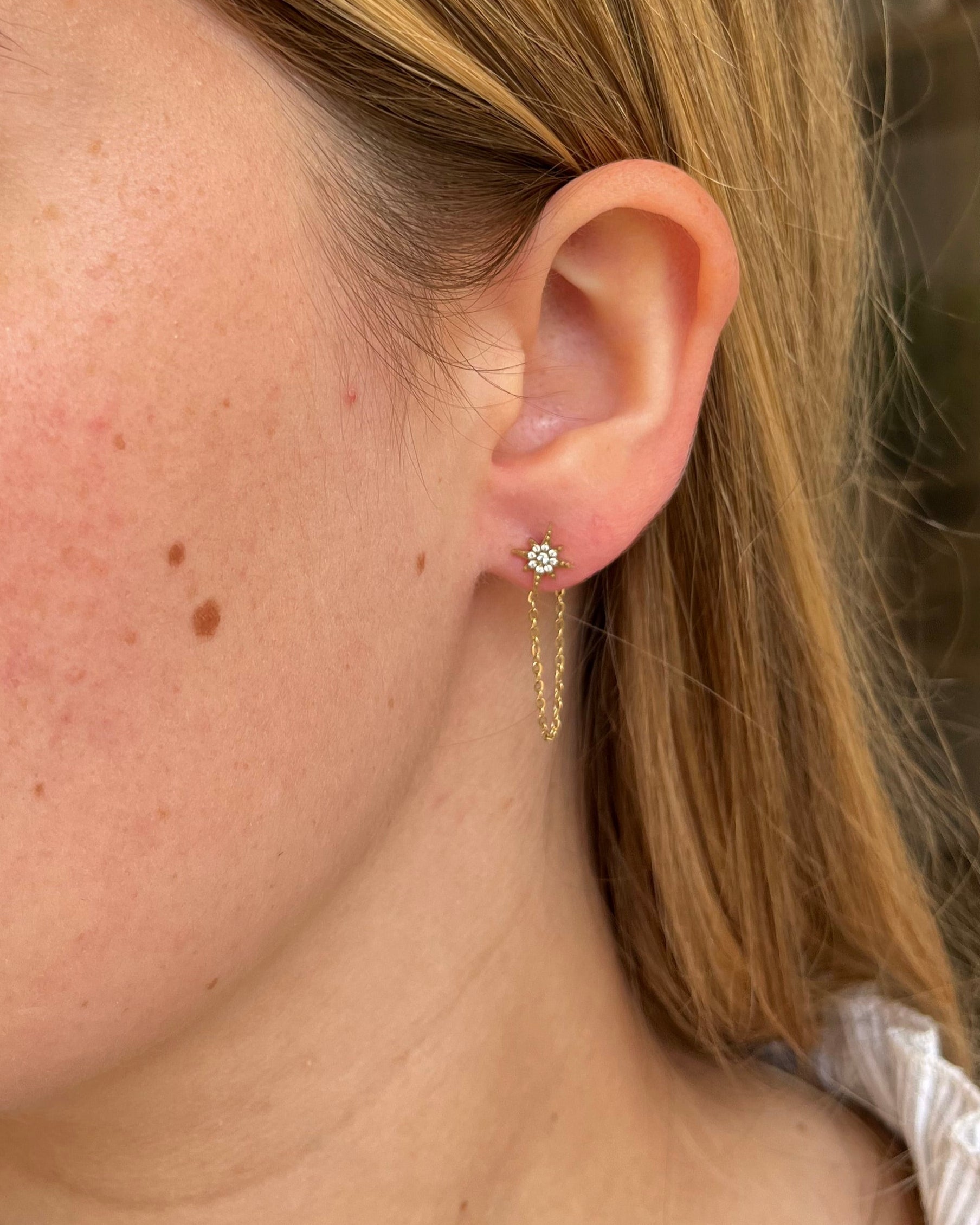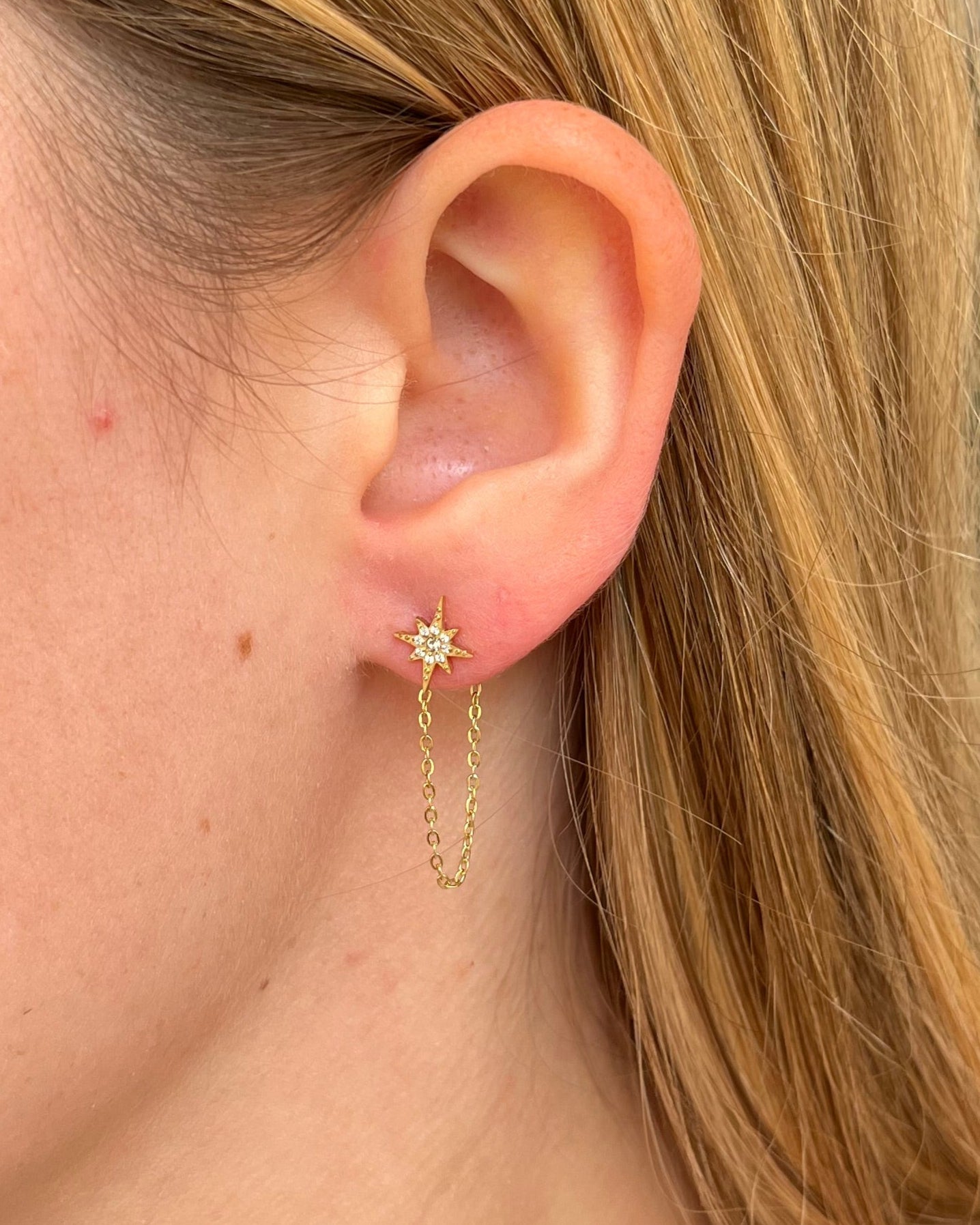 Illuminez votre regard avec ces boucles d’oreilles étoiles délicates, ornées de strass scintillants qui captent la lumière à chaque mouvement. La chaînette fine qui descend jusqu’au fermoir ajoute une touche d’élégance fluide et un effet dangling sophistiqué.